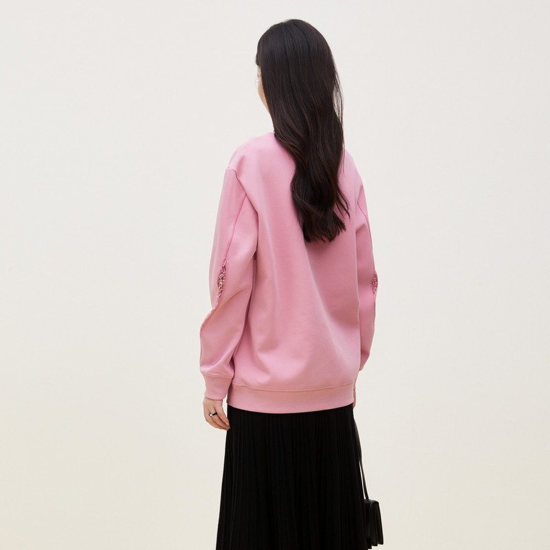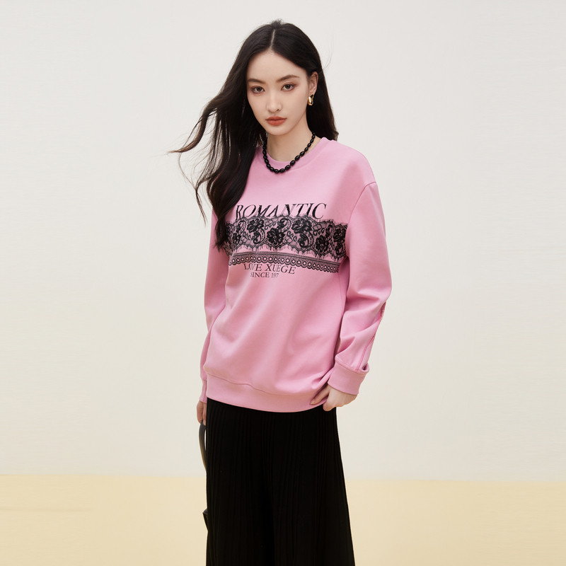 新款 秋季 时尚 粉色设计感圆领上衣女 雪歌XK301749A816蕾丝卫衣
