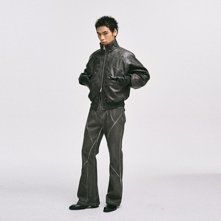 RONOUX潮牌嘻哈美式 三杠条纹立领外套男女春秋情侣宽松飞行员夹克