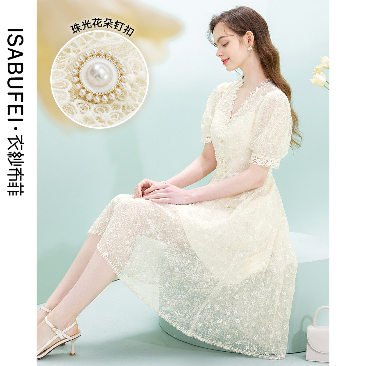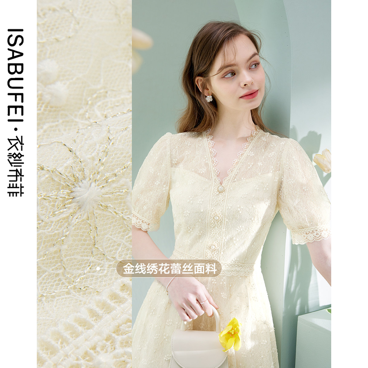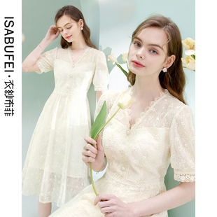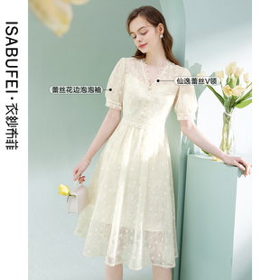 绣花波浪仙女裙子 女夏v领泡泡袖 衣纱布菲月蕊 蕾丝连衣裙新款