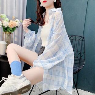 透气冰丝防晒衣女长袖 大码 2024夏季 格子衬衫 宽松雪纺外套 新款 薄款
