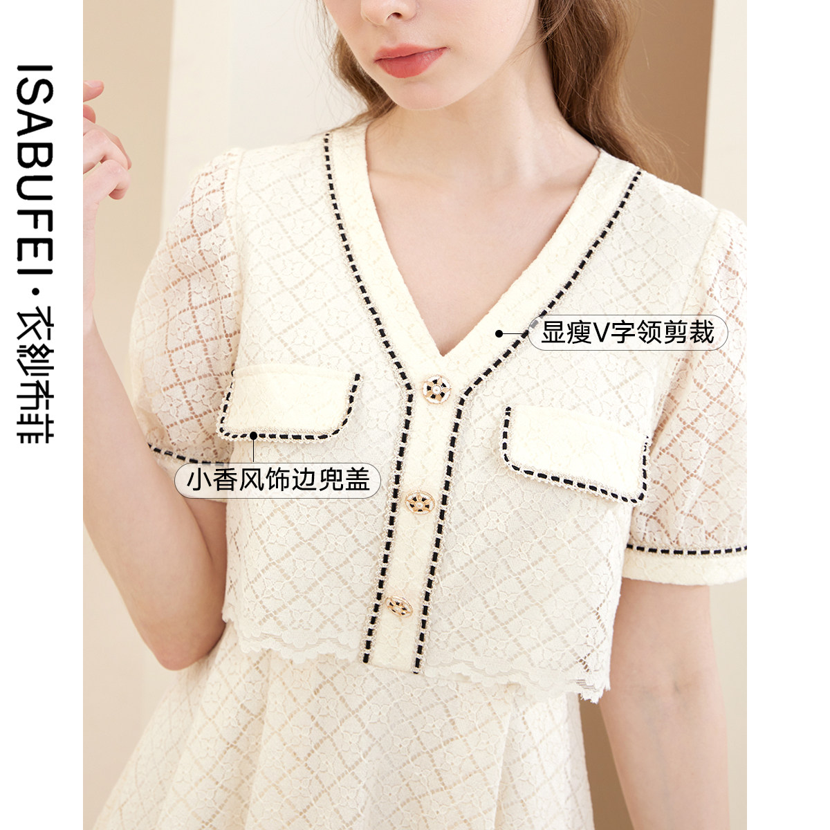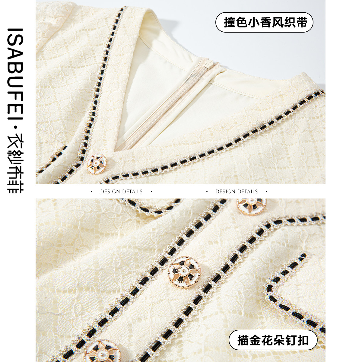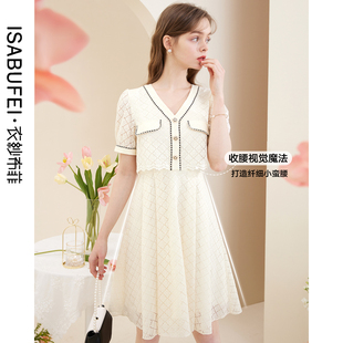 设计感v领菱格假两件裙子 女夏修身 秋歌 小香风蕾丝连衣裙新款