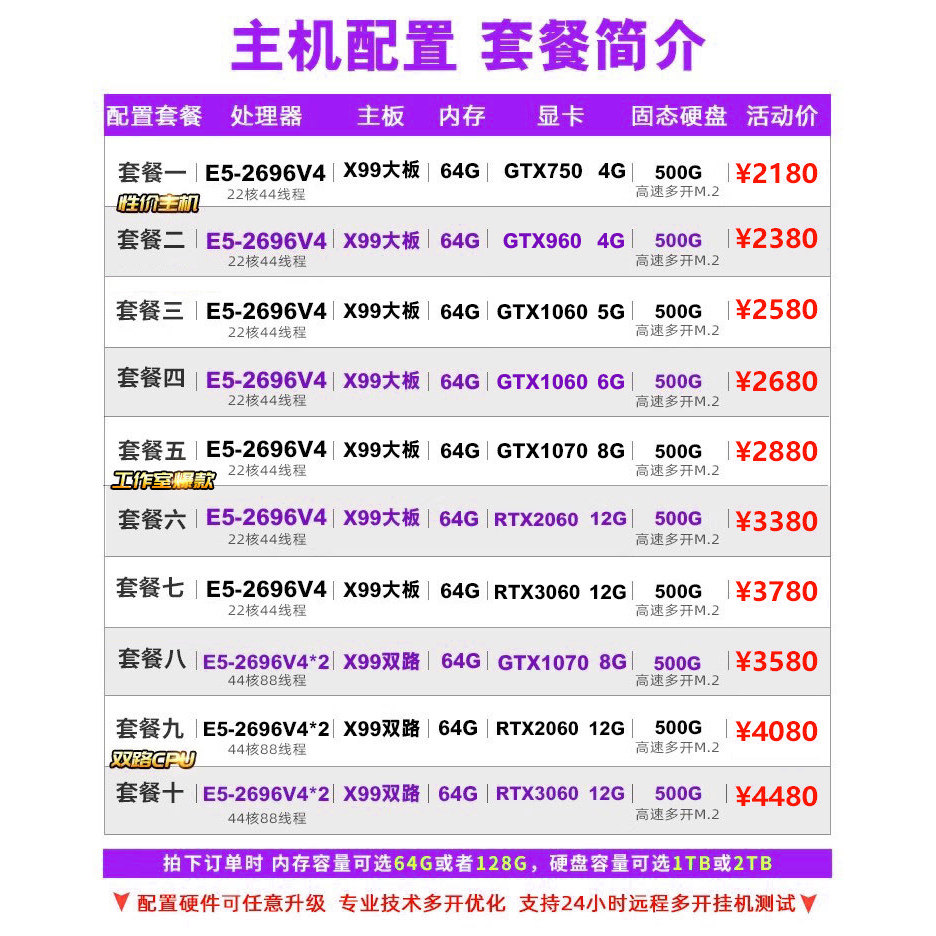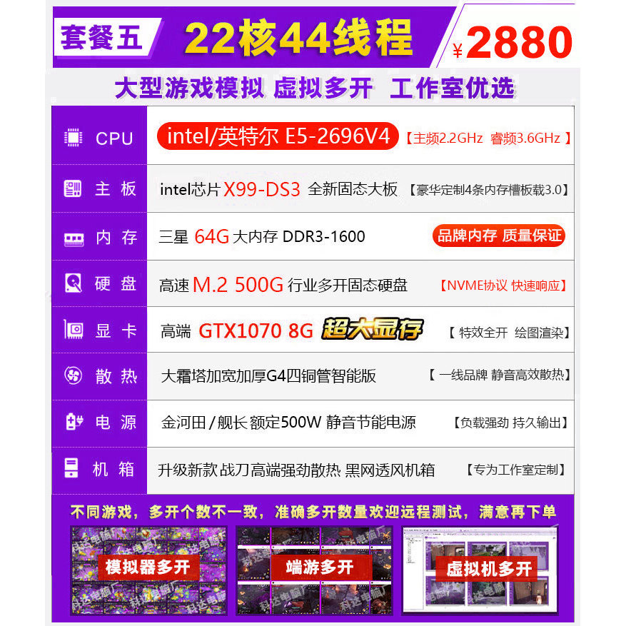四十四核双路E5 机96V3 2696V4主机模拟器游戏多开工作室电脑组装
