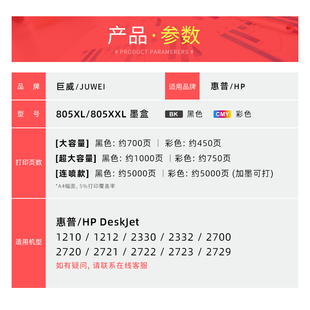 2721 2729彩色打印机1212 1210 适用805XL墨盒黑色惠普hp2720 2332连供改装 2723 2330 可加墨水XL大容量 2722