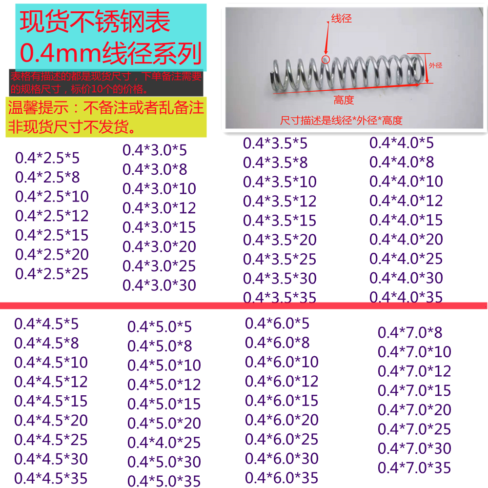 0.2 0.6 0.3 0.5 0.7线径压缩300毫米 0.4 304不锈钢弹簧压簧0.15
