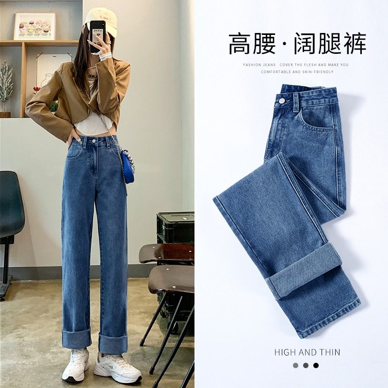 显瘦梨形身材宽松阔腿裤 加绒加厚胖mm大码 女冬季 复古蓝直筒牛仔裤