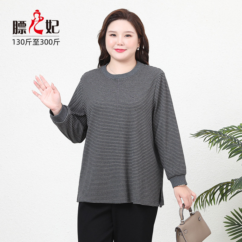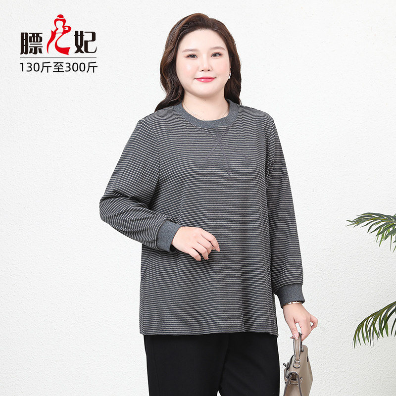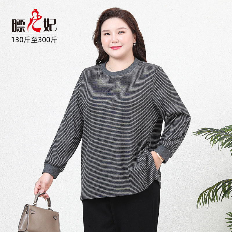 女装 胖mm套头打底衫 条纹长袖 春装 大码 圆领秋冬长袖 上衣 膘儿妃