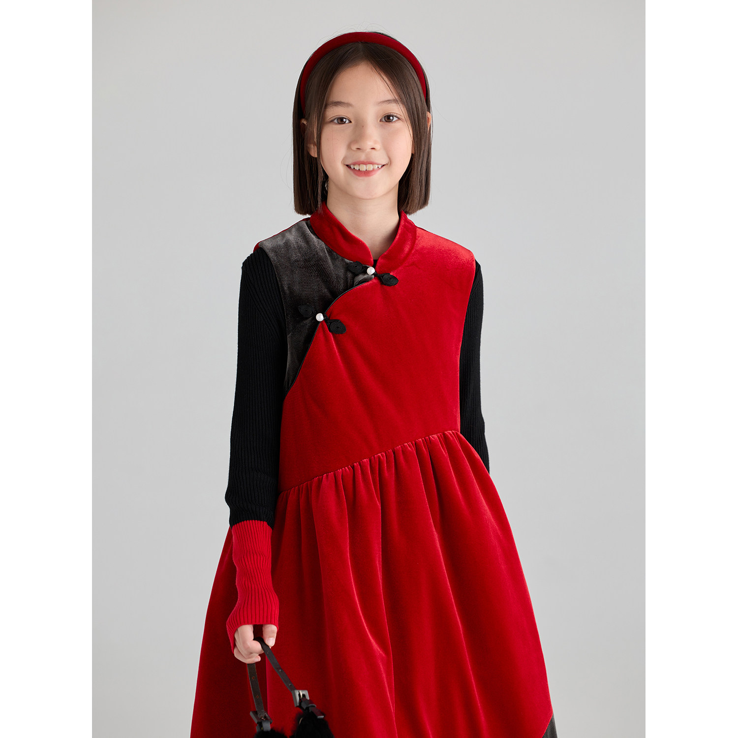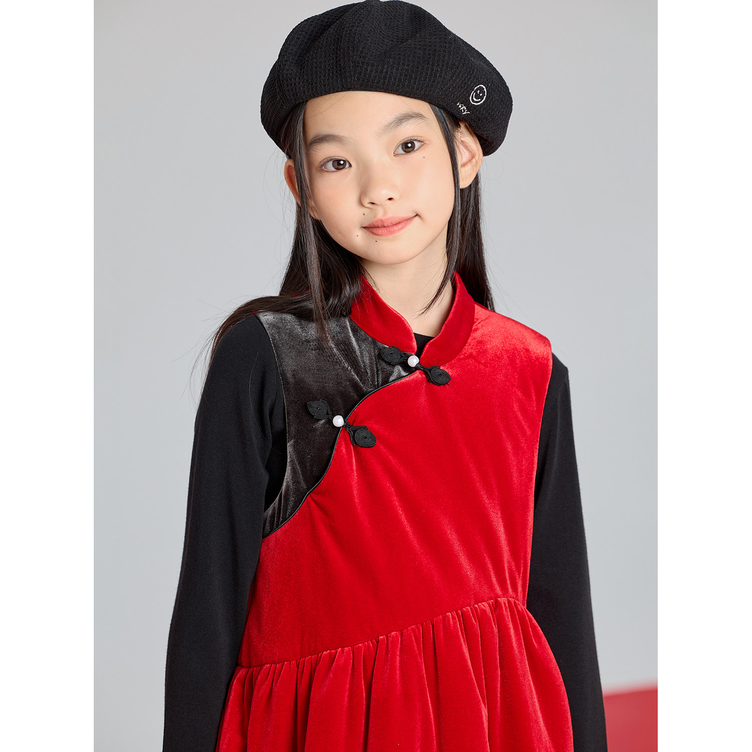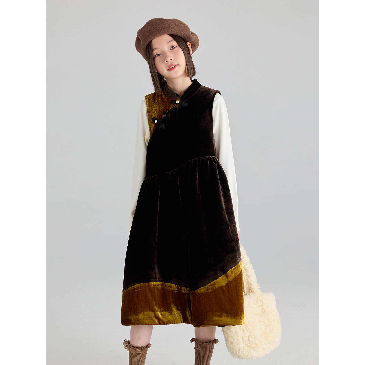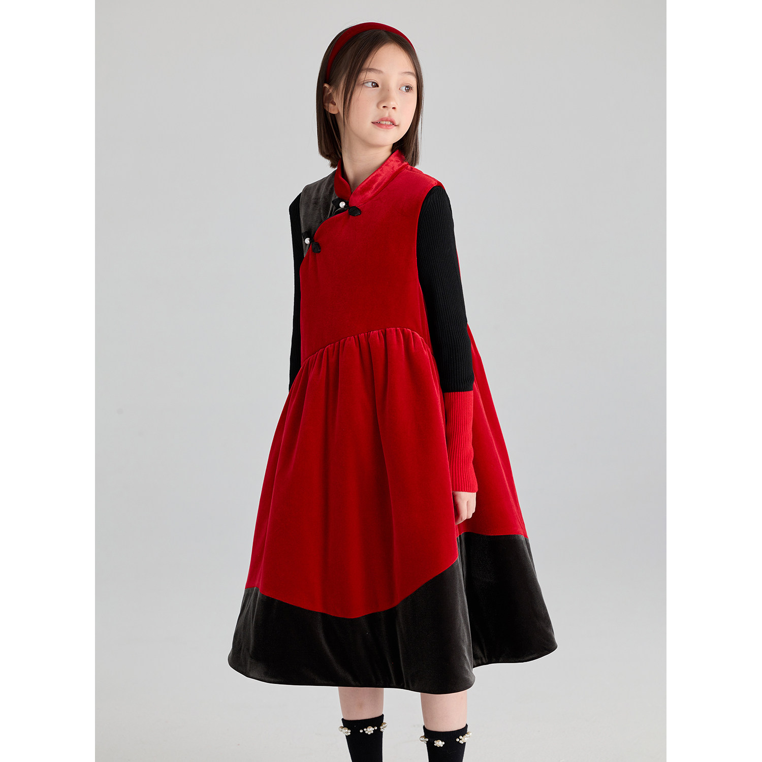 撞色拼接 MIMIGOGO 旗袍领珍珠盘扣儿童廓形连衣裙3J06 2折