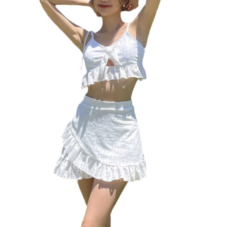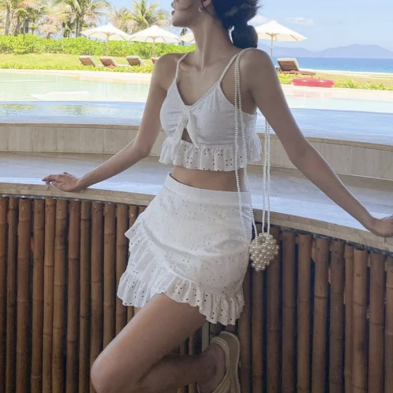 泳衣女三件套 性感露背高腰遮肚系带荷叶边分体裙式 新款 度假风泳装
