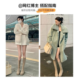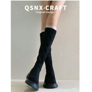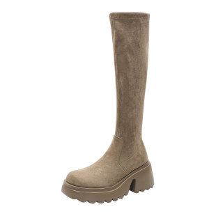高跟厚底长靴子卡其色麂皮绒面高筒靴2024秋冬新款 小个子长筒靴女
