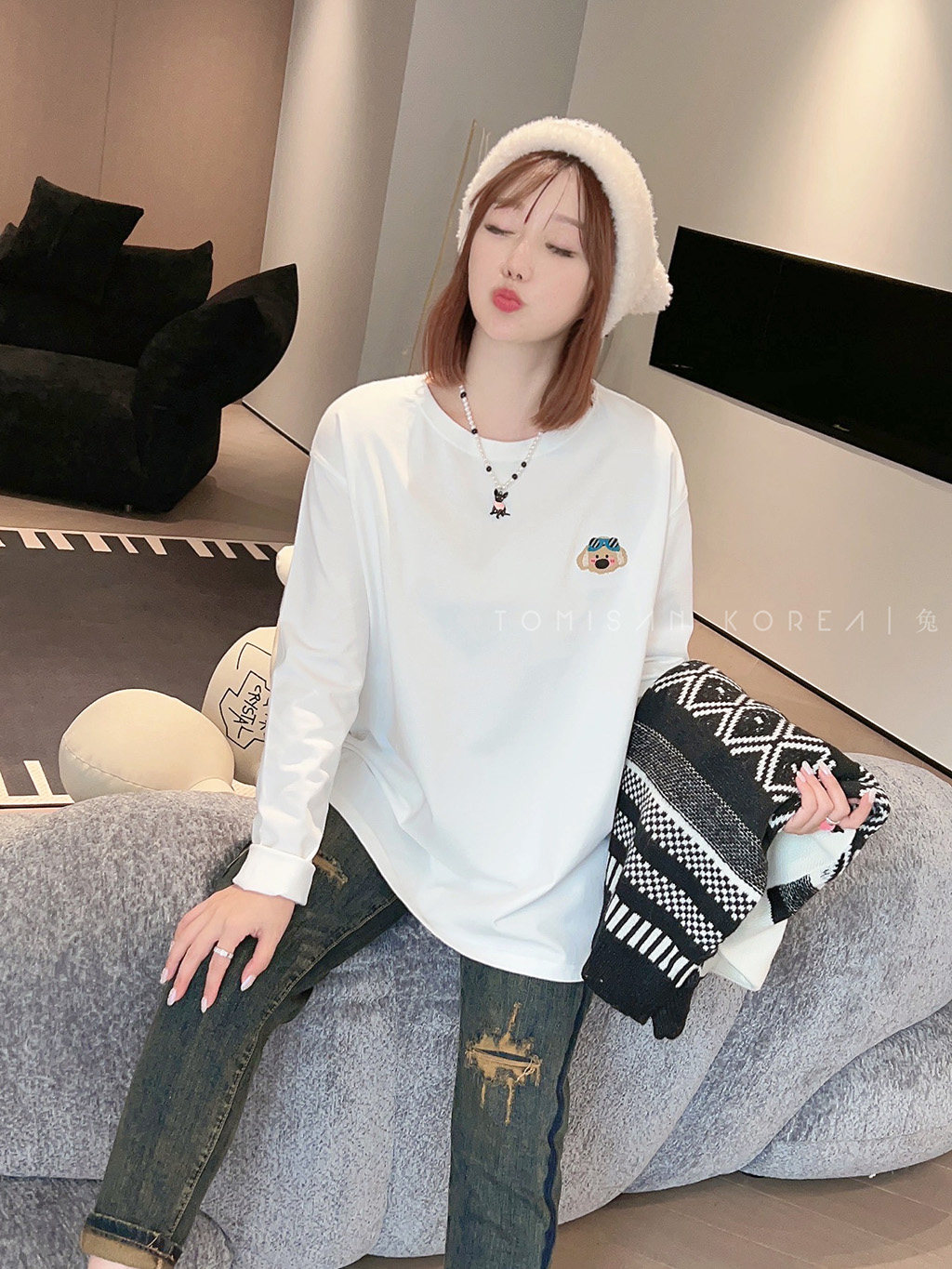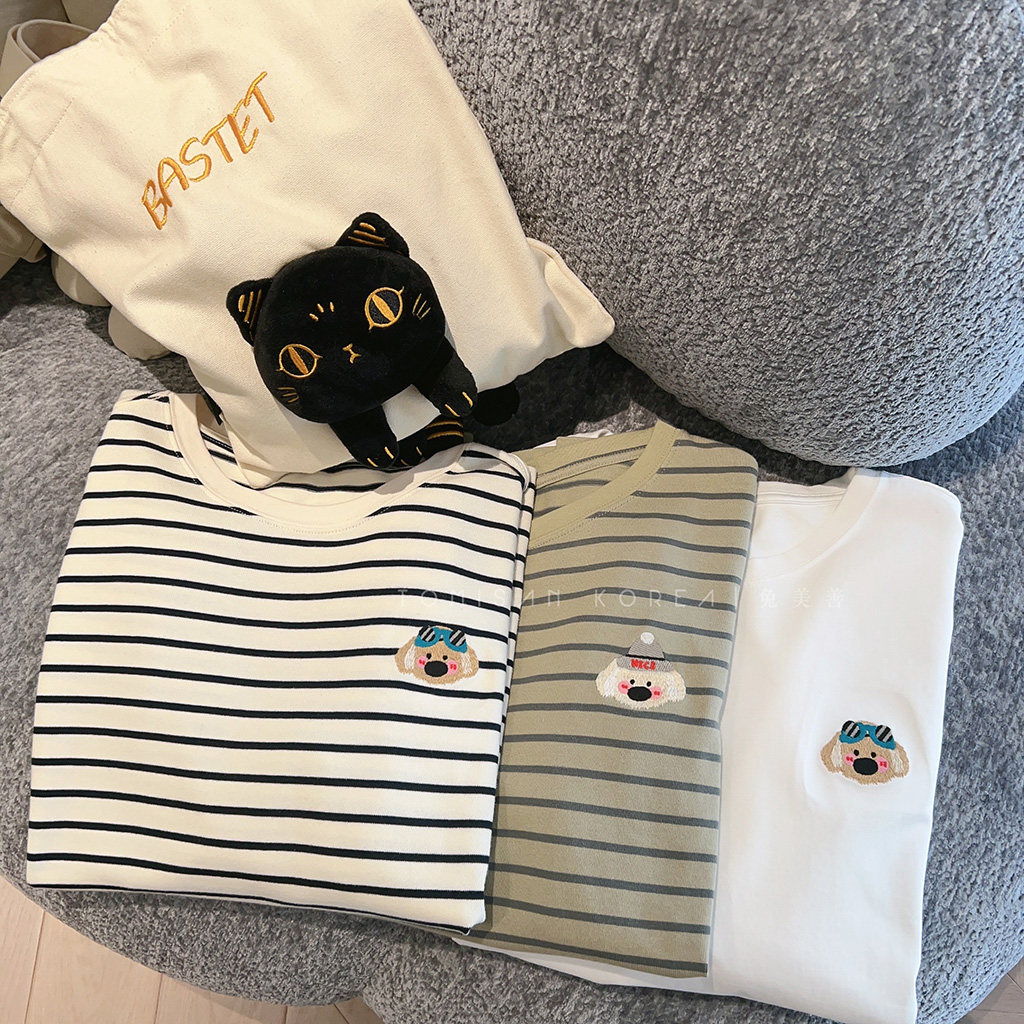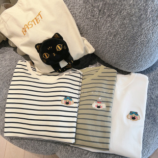 可爱条纹卡通刺绣休闲百搭长袖 秋新 T恤 女装 兔美善韩国代购