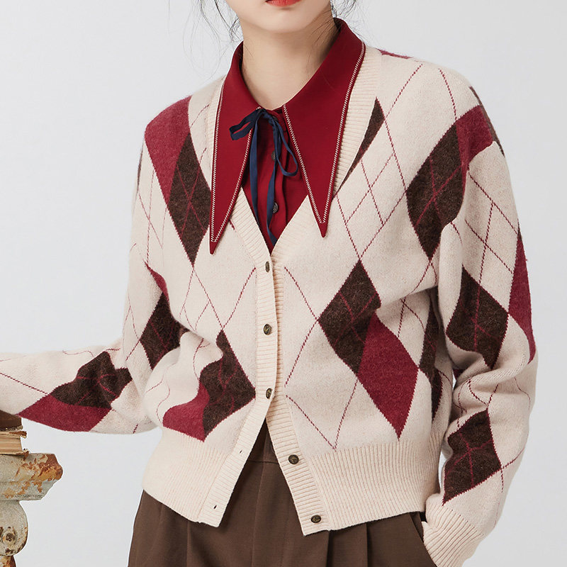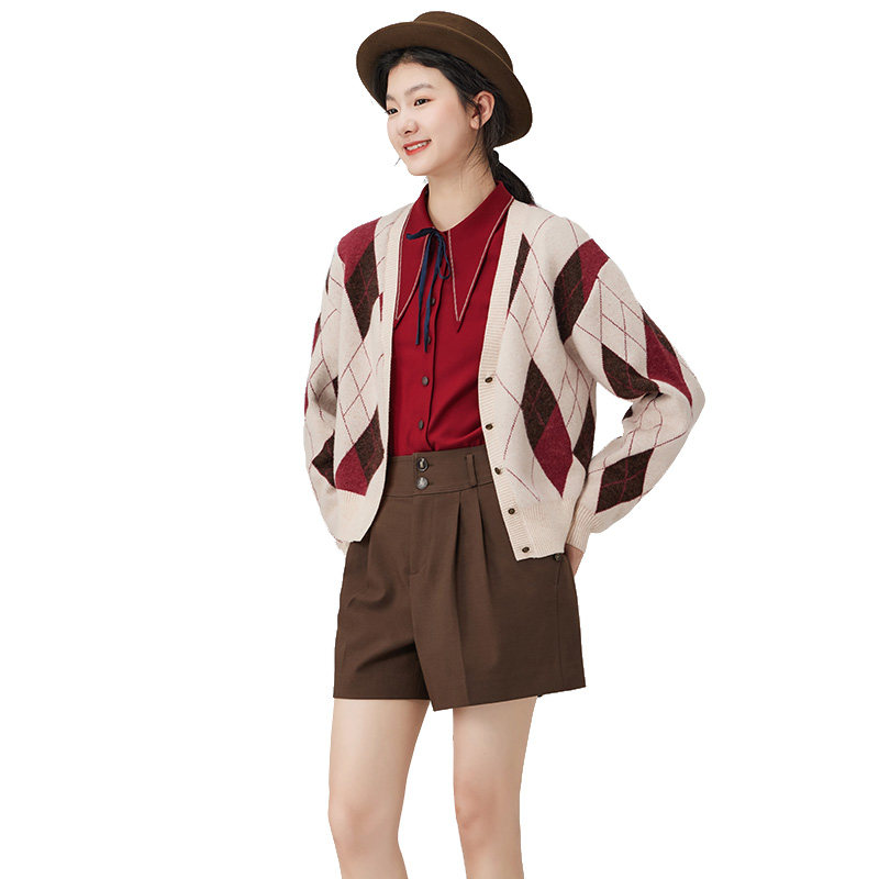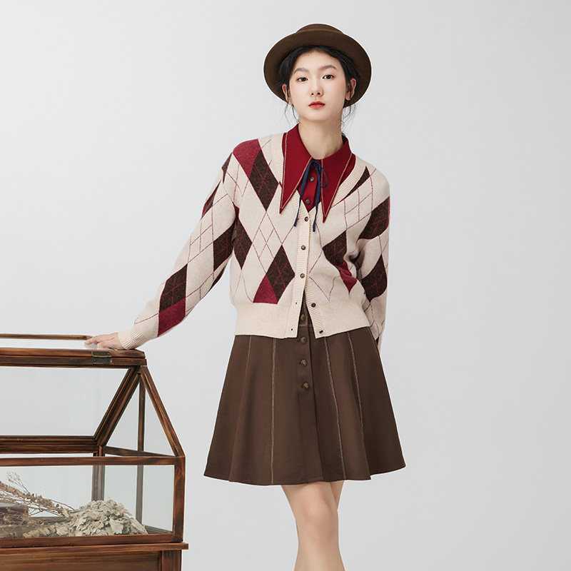米红咖撞色格纹羊毛开衫 迪哈利冬新款 DH234C96608D HARRY