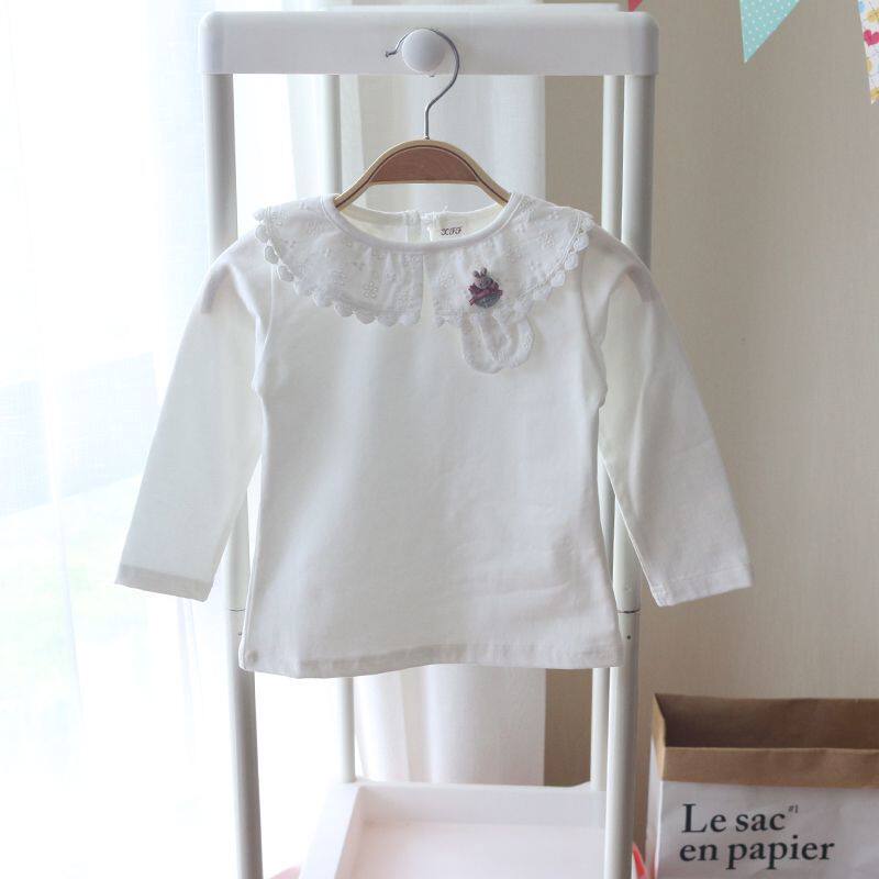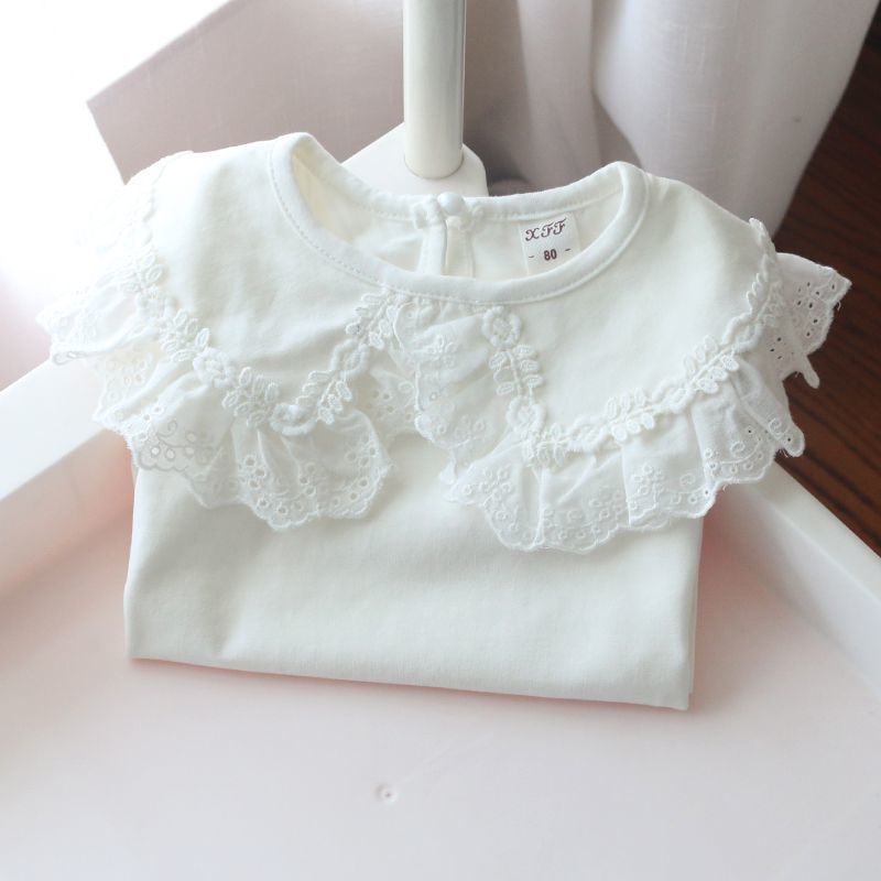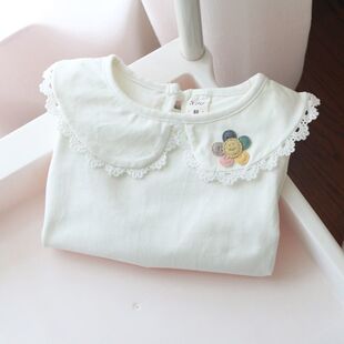 女童白色薄款 翻领T恤上衣春夏儿童女孩娃娃领蕾丝花边宝宝打底衫