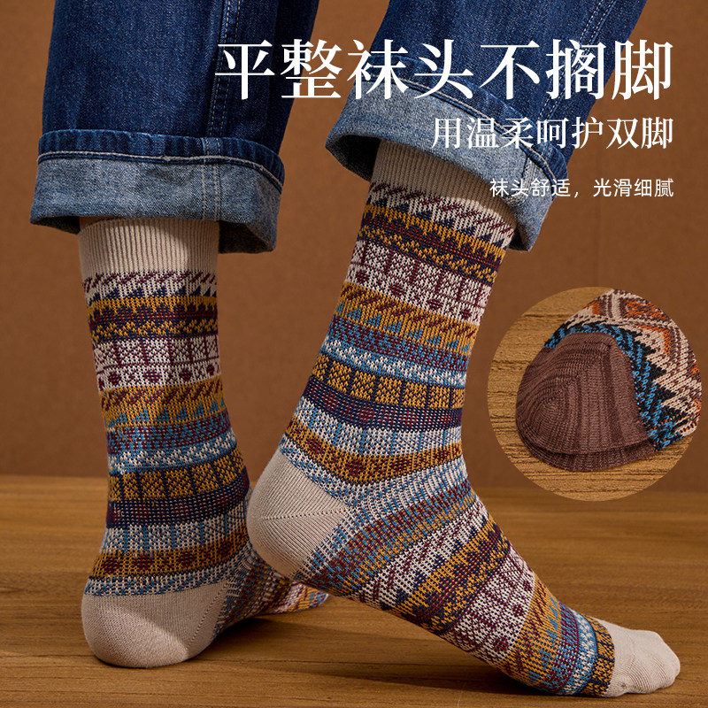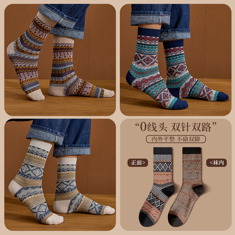 佐印3双男士 吸汗中筒袜文艺复古民族风防臭日系长筒袜 袜子夏薄款