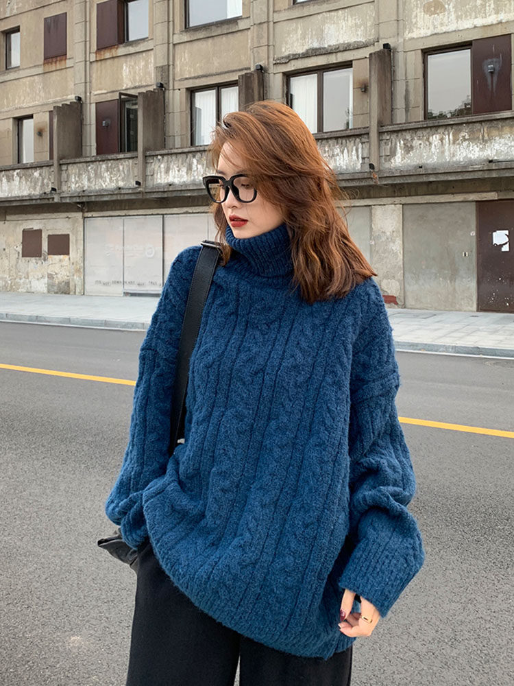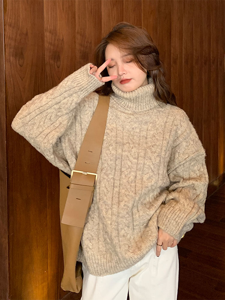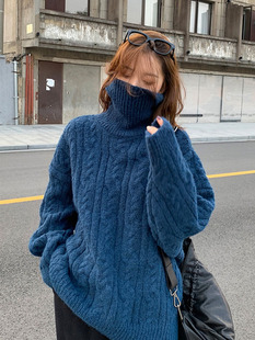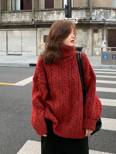 日系复古红色麻花高领毛衣女秋冬新款 宽松慵懒风加厚内搭针织上衣