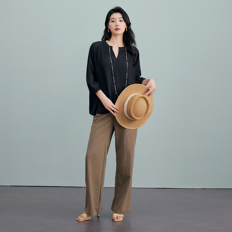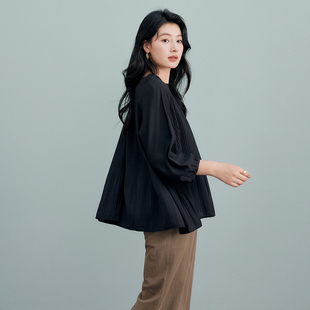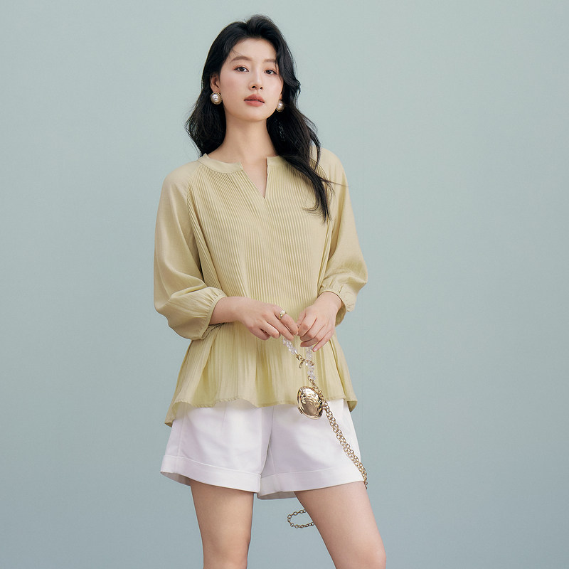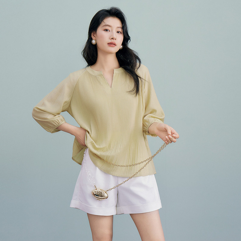 衬衫 百家好醋酸七分袖 法式 宽松纯色压褶小衫 Basic 2026夏季 House