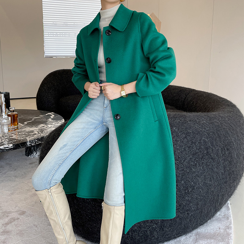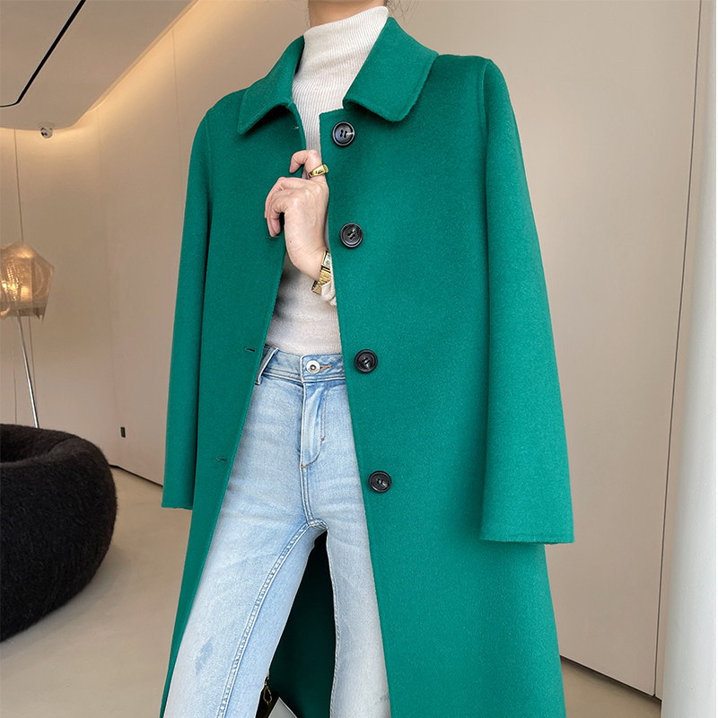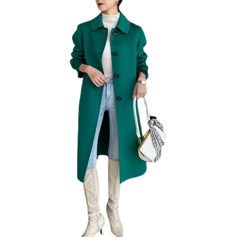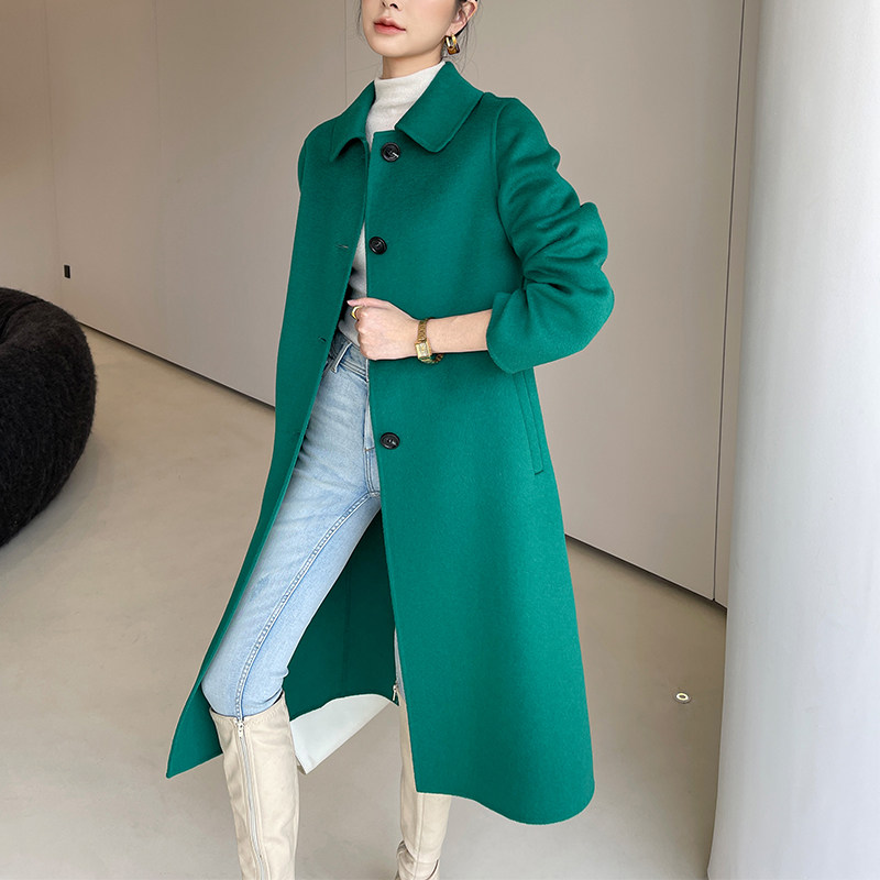 赫本风绿色修身 秋季 呢子羊毛呢外套 2024新款 双面羊绒大衣中长款