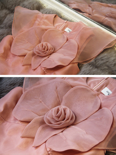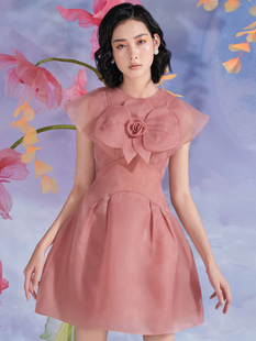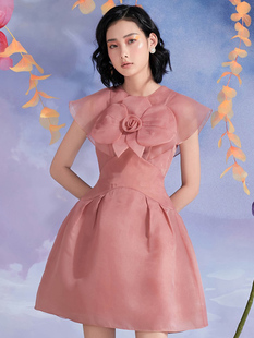 欧更纱a字晚礼服粉色小个子裙子宴会礼服仙女裙立体花砍袖 连衣裙