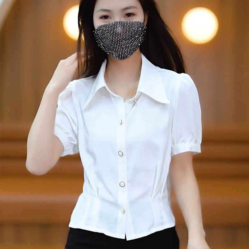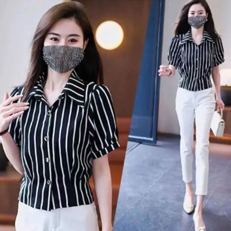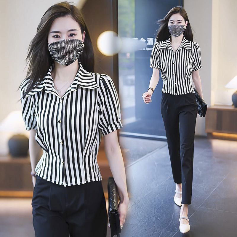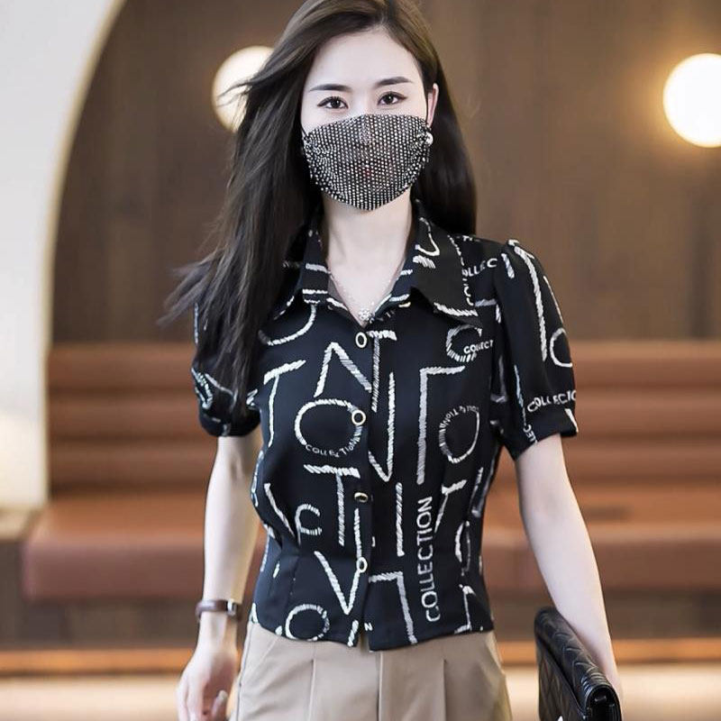 修身 百搭气质印花短袖 新款 女2023夏季 显瘦洋气休闲翻领衬衣 雪纺衫