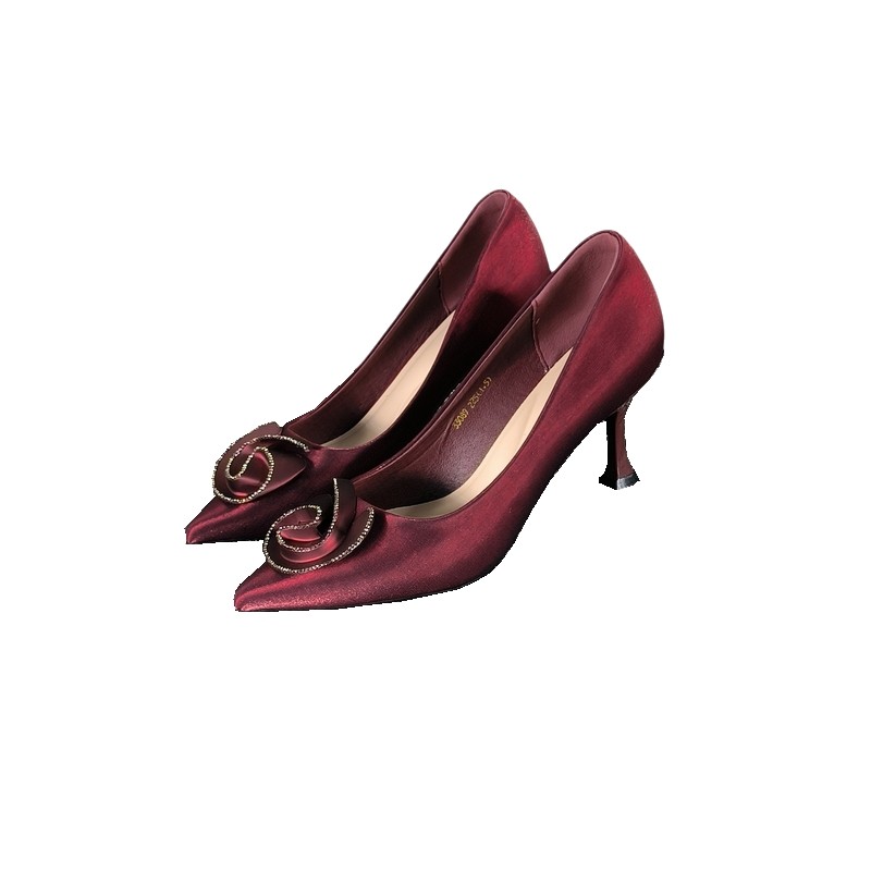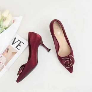 尖头浅口性感御姐细跟绝美单鞋 v口酒红色高跟鞋 女侧空2025春新款