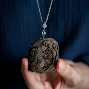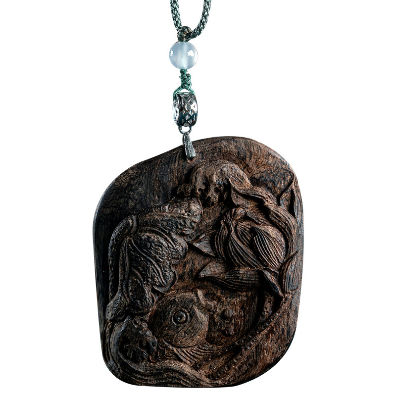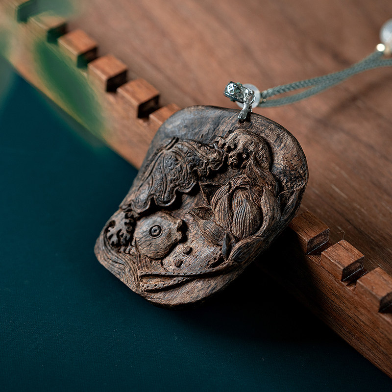 沉水越南芽庄绿奇楠沉香雕刻锦鲤荷花吊坠香木挂饰女男款 文玩挂件