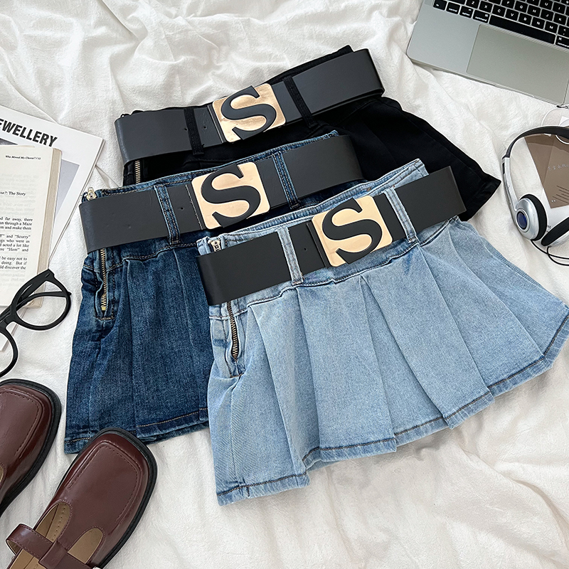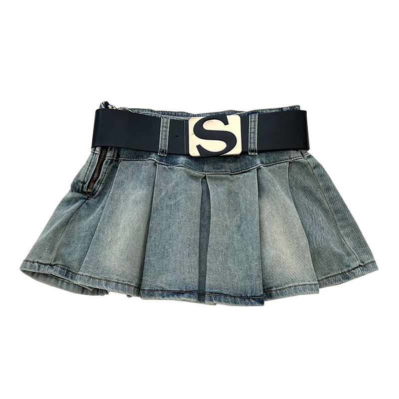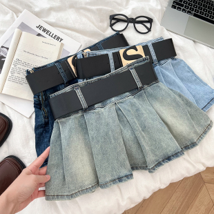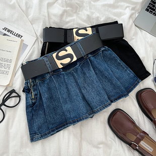 设计感辣妹时尚 字母腰带高腰显瘦牛仔半身裙百褶裙防走光短裙女