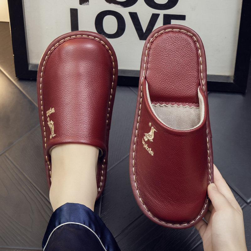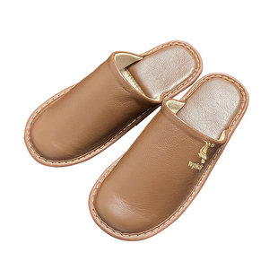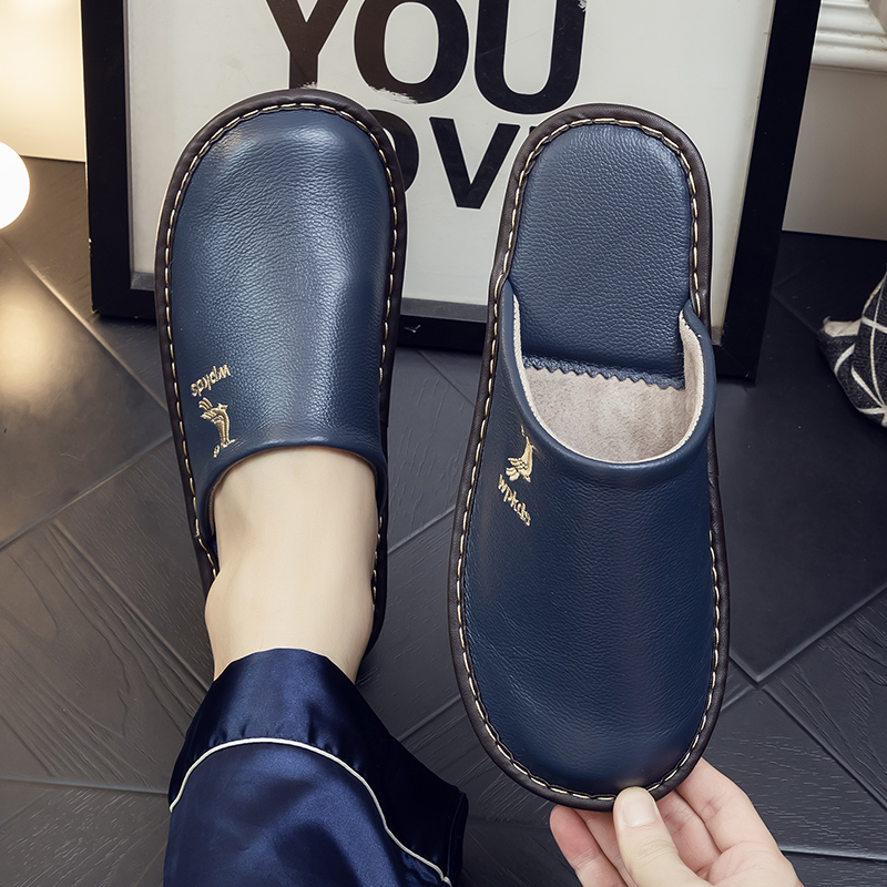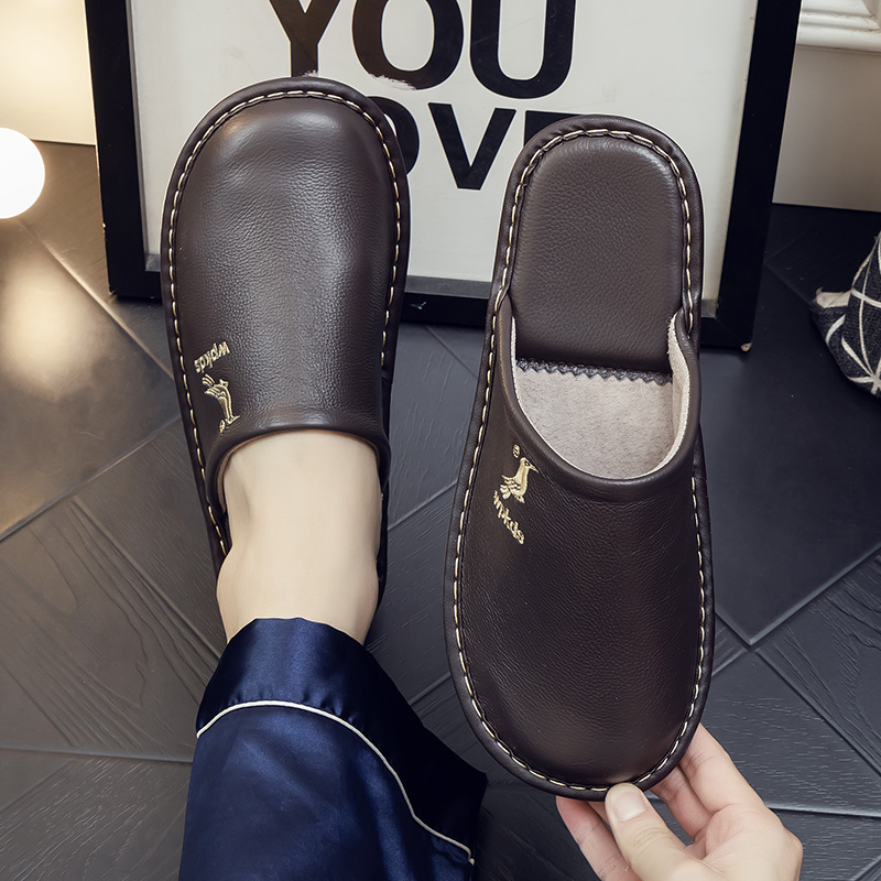 啄木鸟牛皮面防水春秋冬居家真皮防臭棉拖鞋 防滑 男女室内家用四季