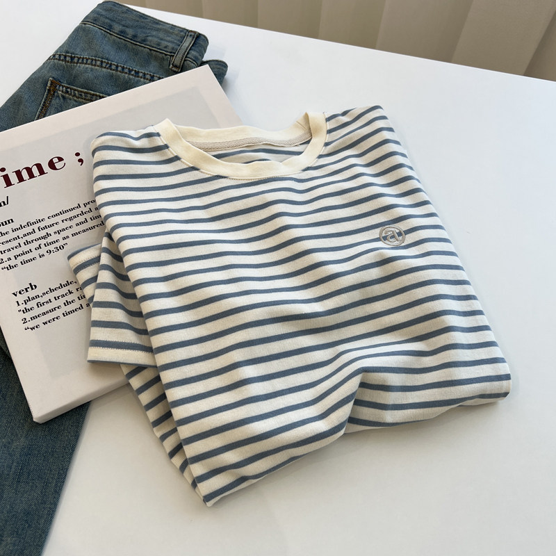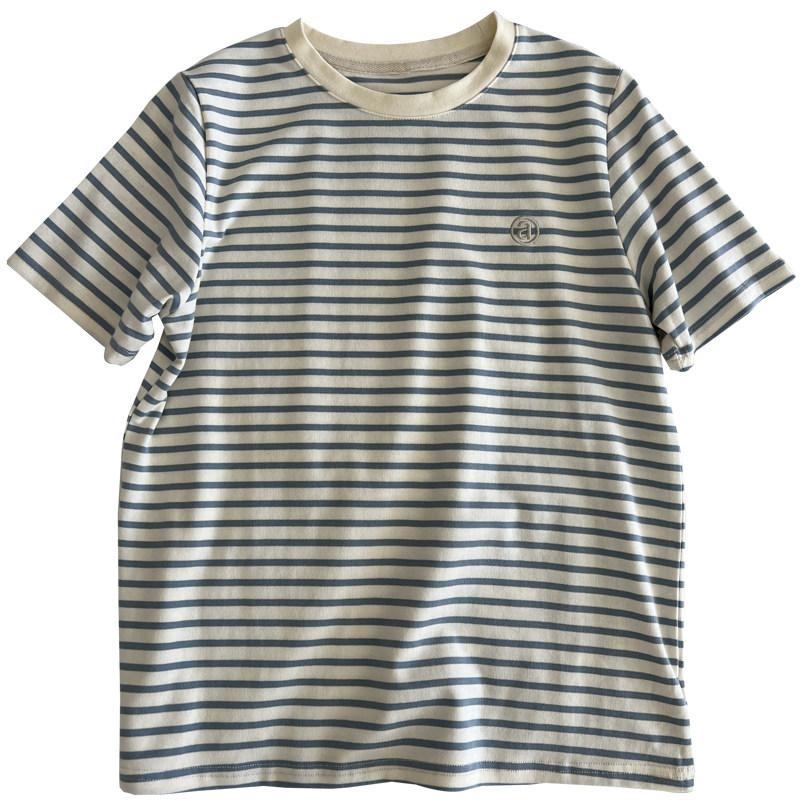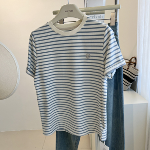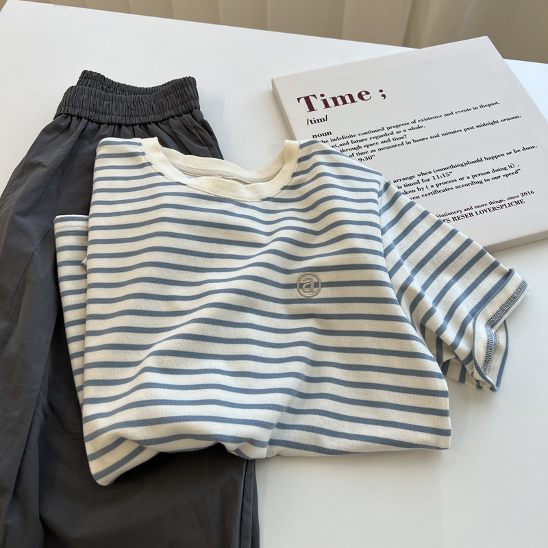 学生减龄 上衣夏季 日系复古撞色字母条纹短袖 t恤女宽松慵懒打底衫