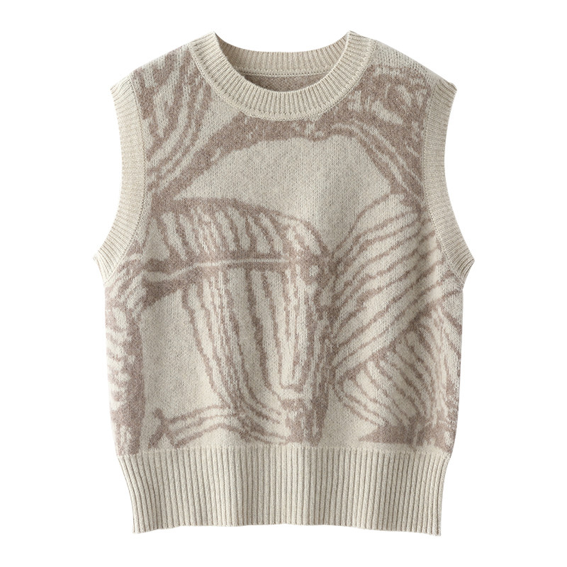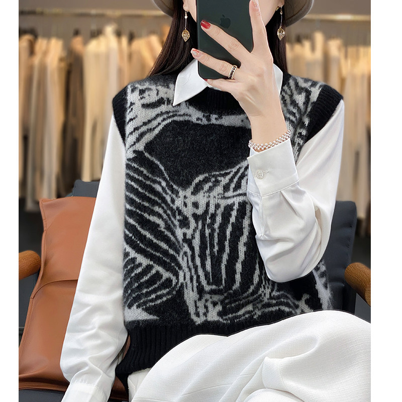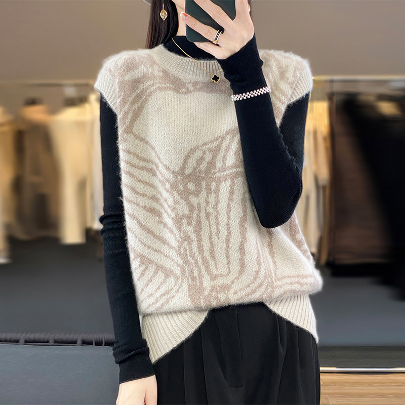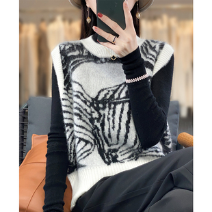 上衣 坎肩背心叠穿羊绒打底衫 拼色圆领100%纯羊毛衫 马甲女宽松无袖