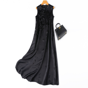 墨色生香 喜上眉梢真丝提花缎加长黑色气质背心连衣裙盘扣 新中式