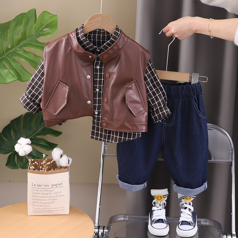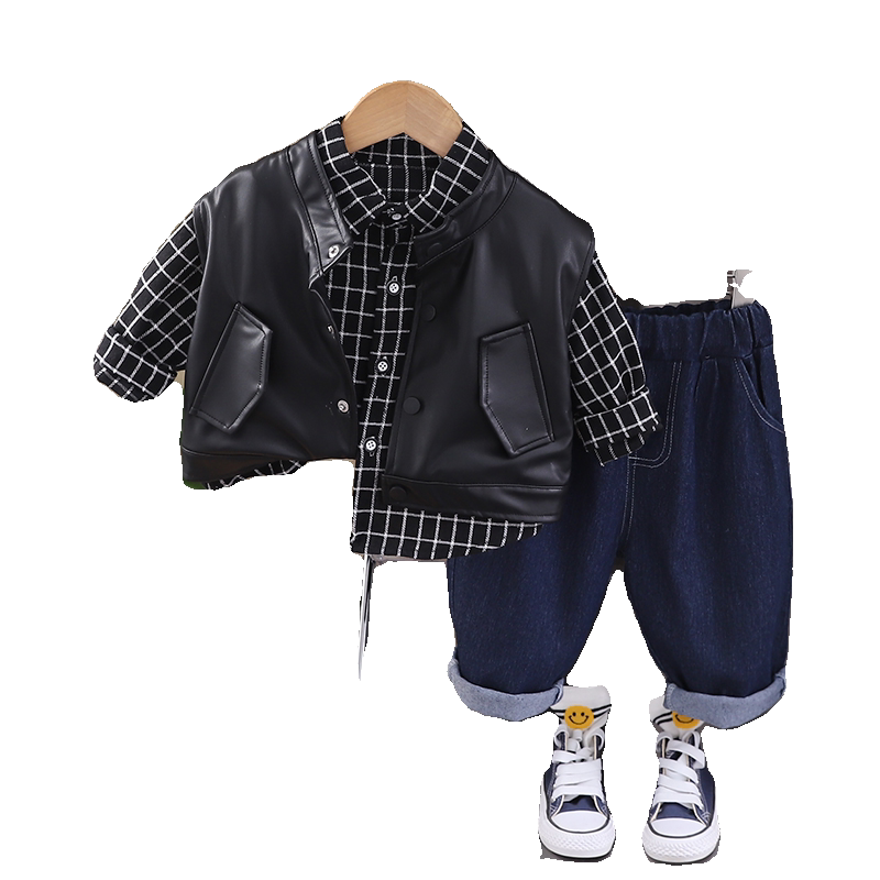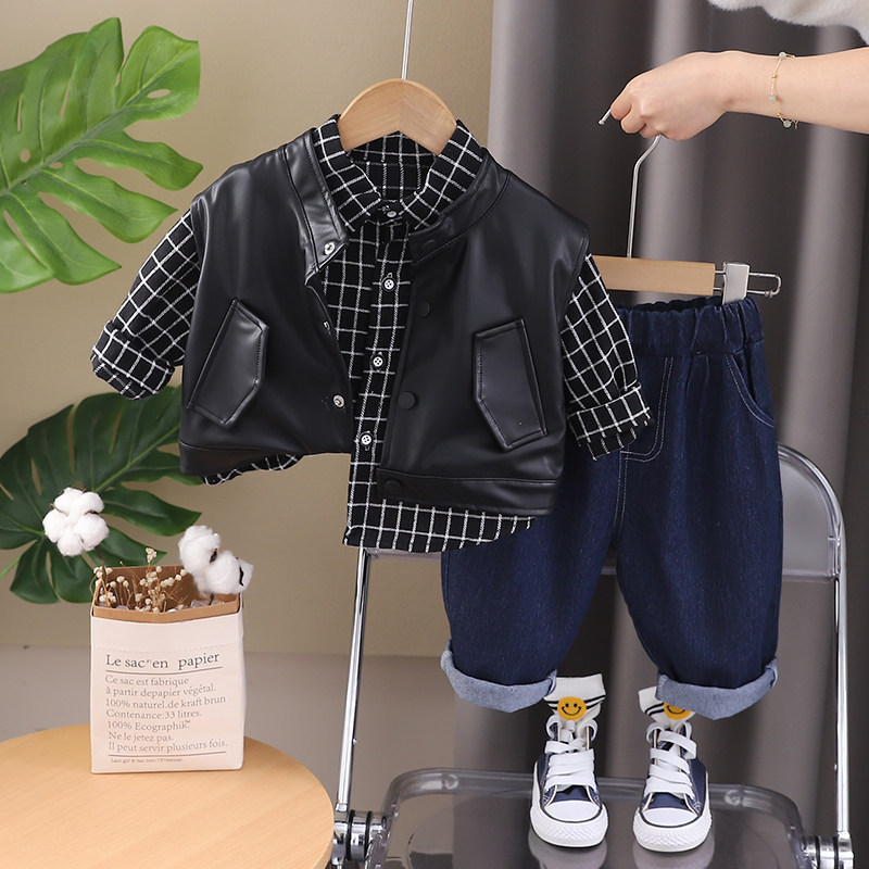 宝宝春秋季 男童秋装 衬衫 韩版 男孩衣服儿童皮衣酷帅洋气三件套 套装