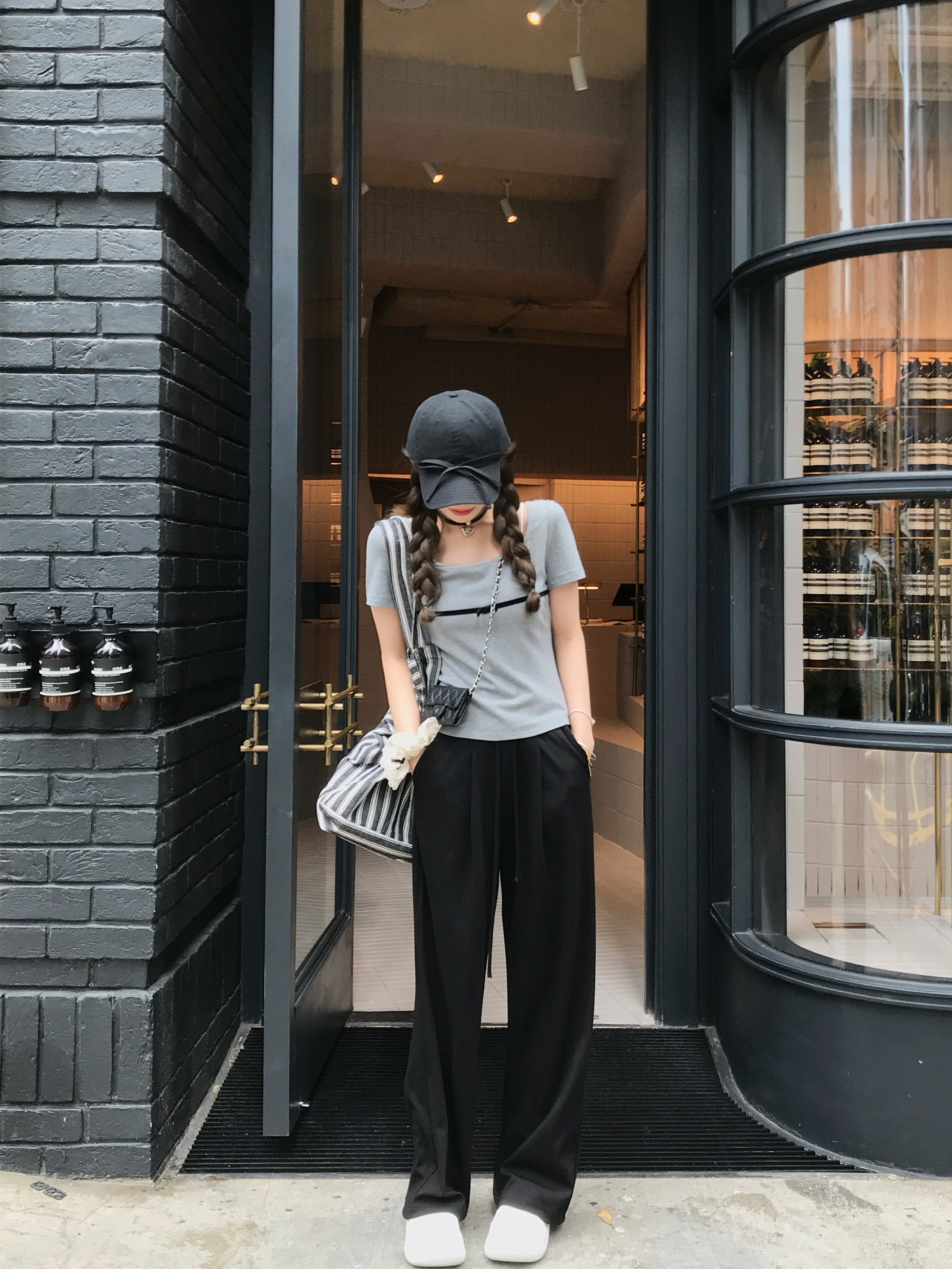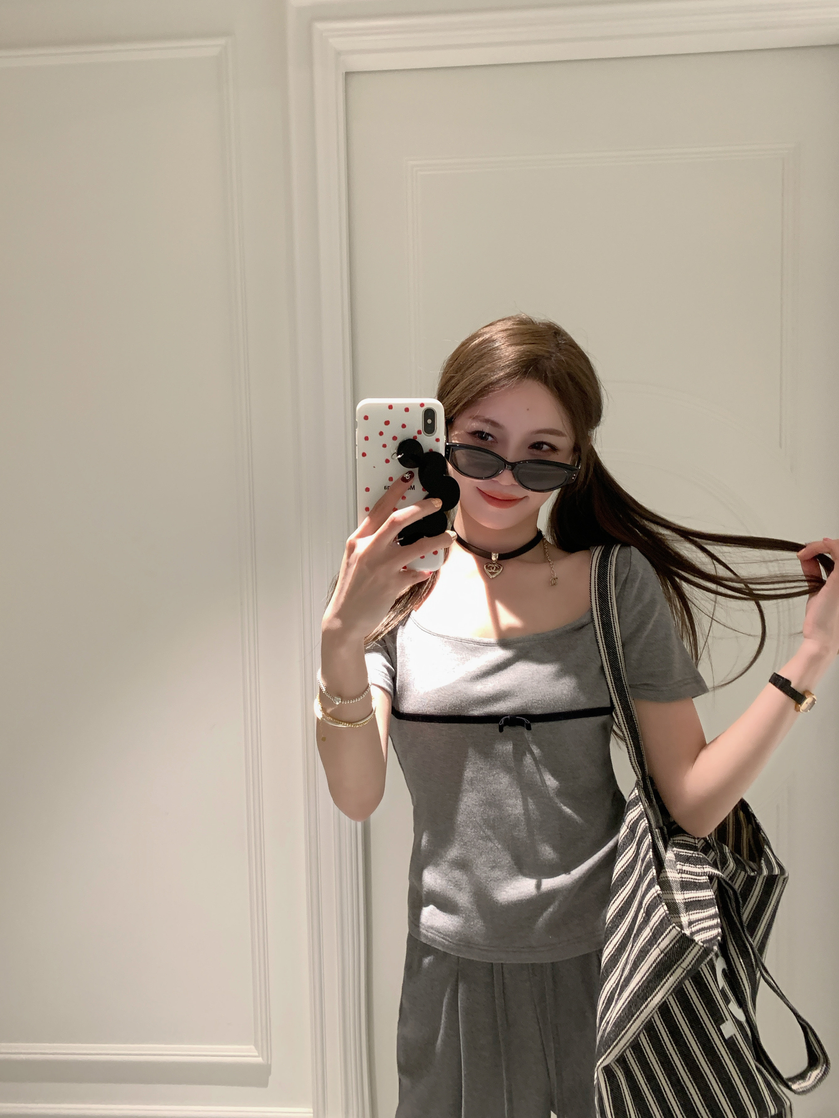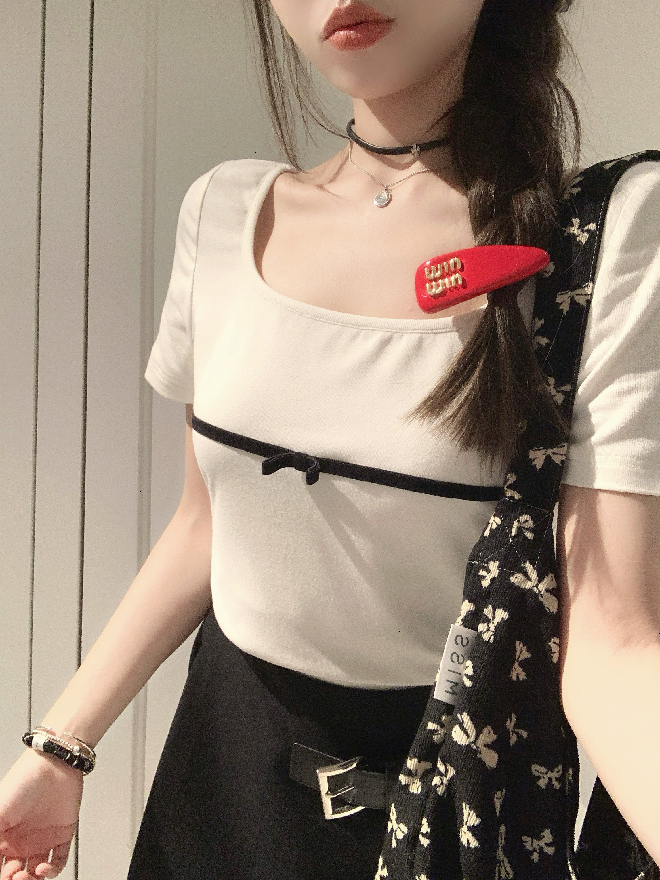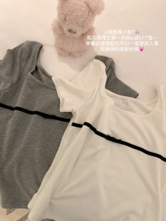 显瘦白色短袖 高弹U领立体蝴蝶结小短T休闲修身 白桃苏打 BLUE