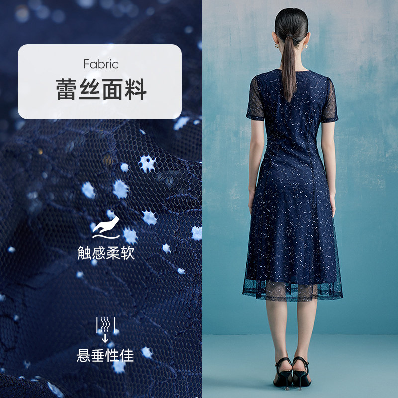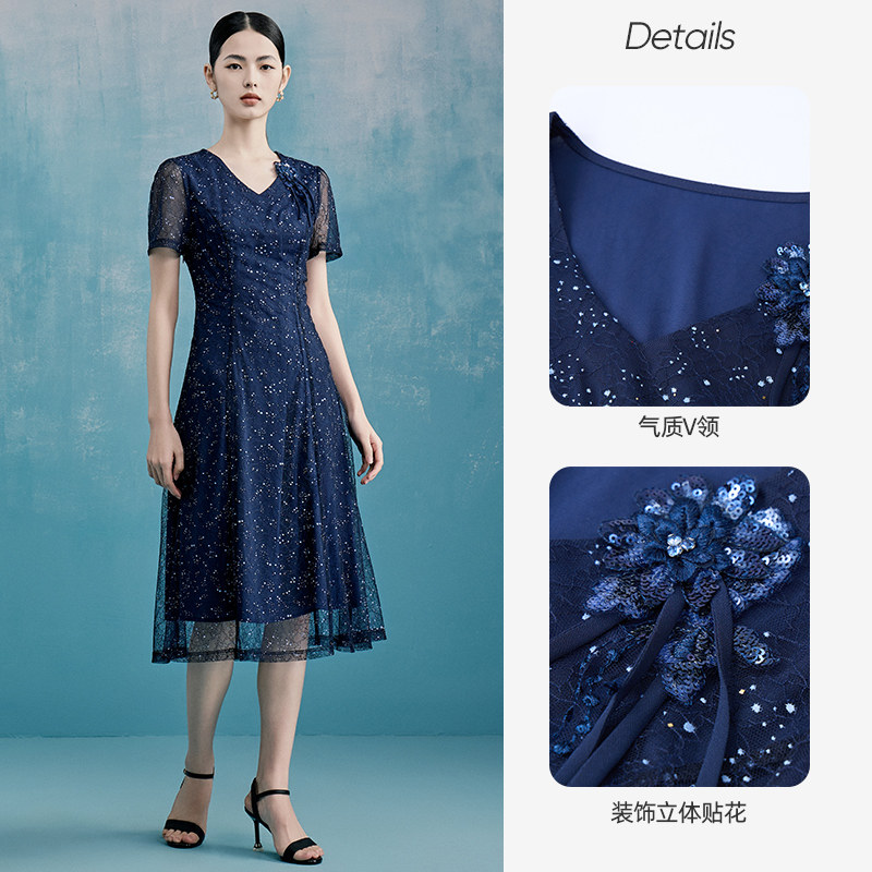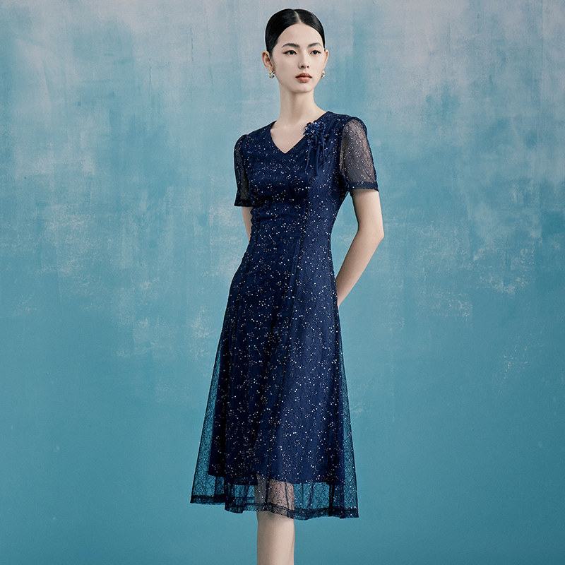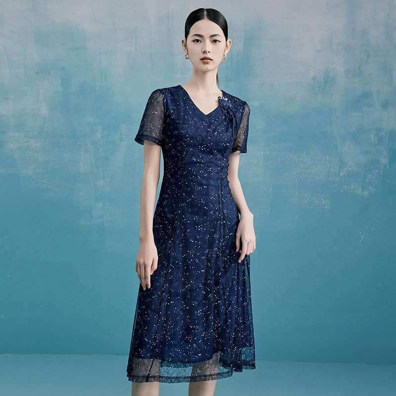 流行 新款 马天奴藏蓝色V领蕾丝短袖 连衣裙子简约收腰长裙礼裙夏季