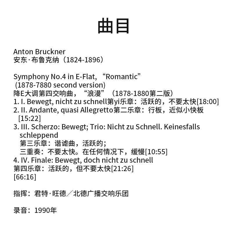 旺德 布鲁克纳 君特 古典CD唱片 第四浪漫交响曲 BEST100系列