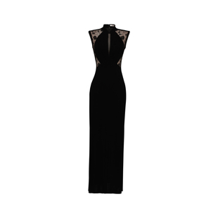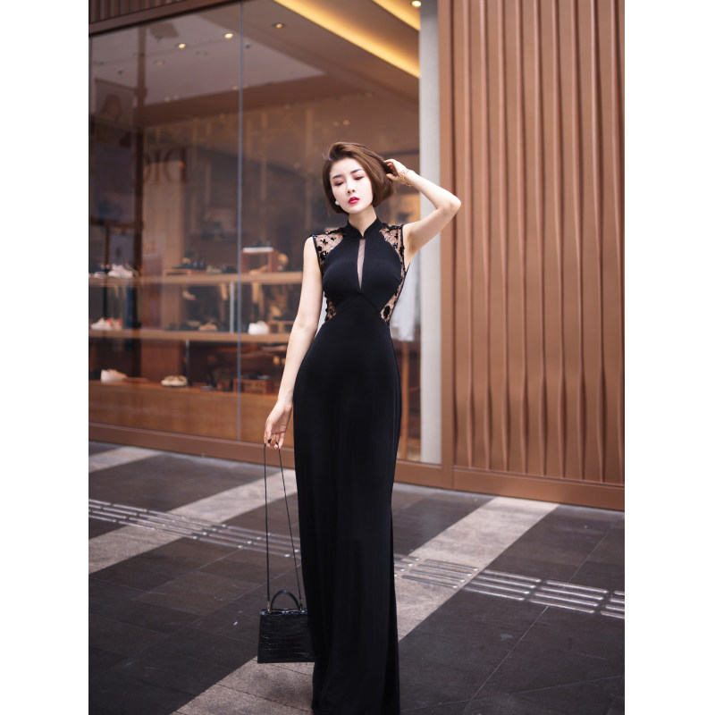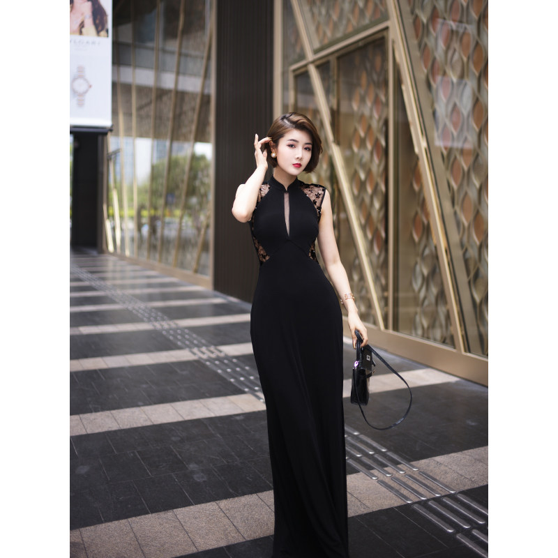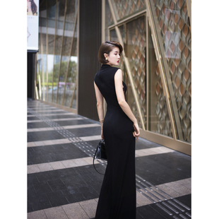 XULU原创醋酸小众复古优雅无袖 改良旗袍拼接亮片前中镂空连衣裙