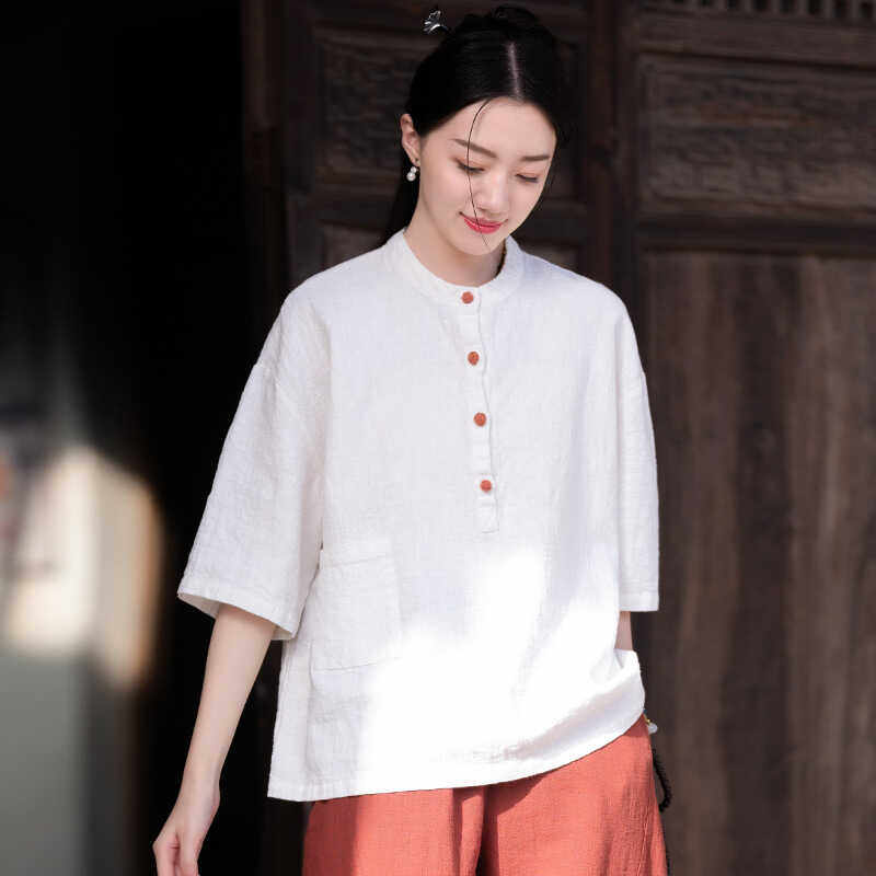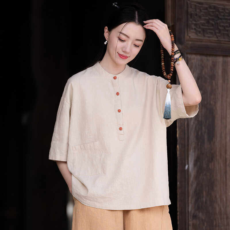 上衣女夏棉麻佛系茶服复古亚麻衬衫 国风盘扣唐装 禅意套装 新中式