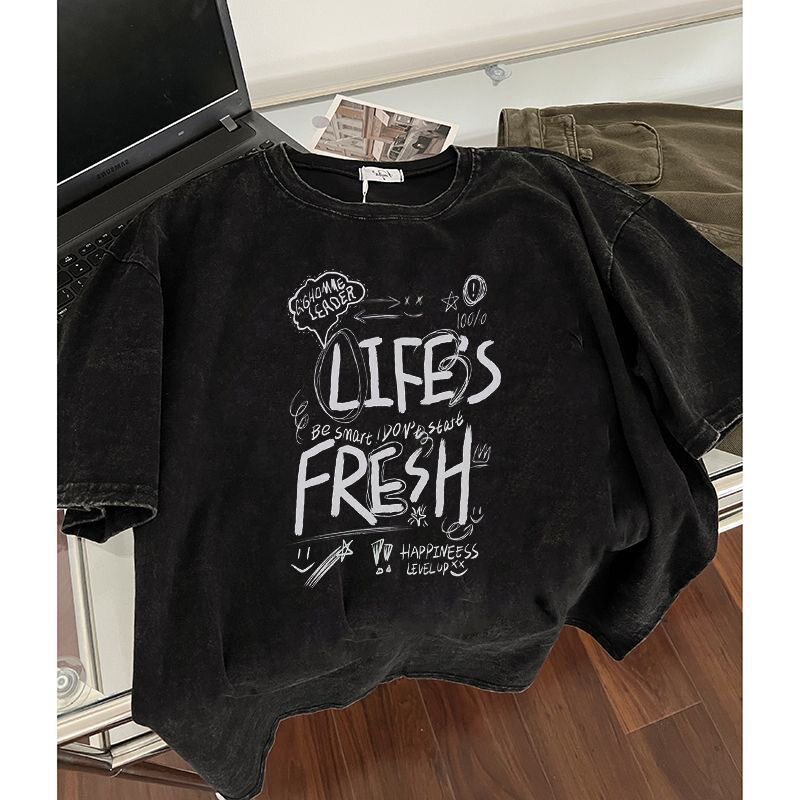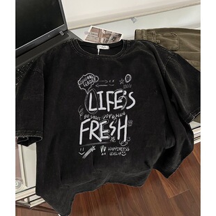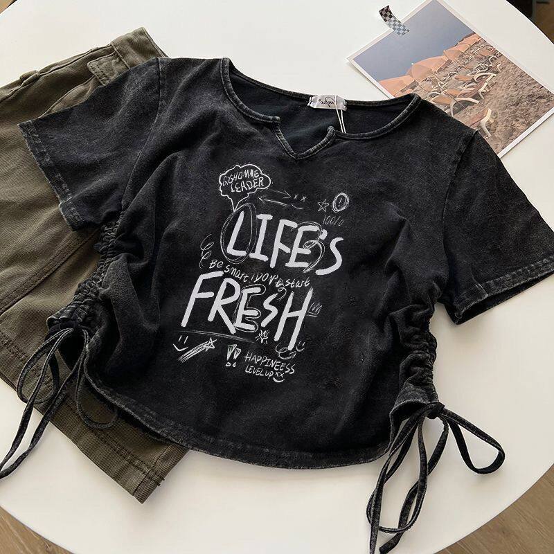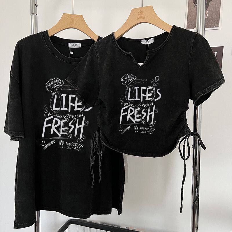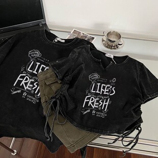 抽绳上衣情侣装 美式 甜辣短款 T恤女夏季 潮ins 复古水洗做旧字母短袖