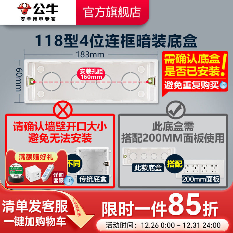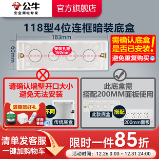 公牛插座旗舰插座开关 H16适用200mm面板 118型底盒4位暗盒布线盒