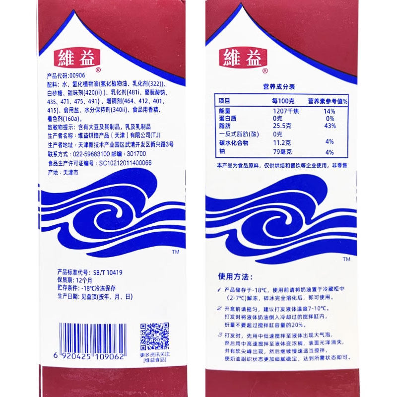海融沁护含乳脂植脂奶油980g 蛋糕裱花蛋挞液易打发烘焙 包邮