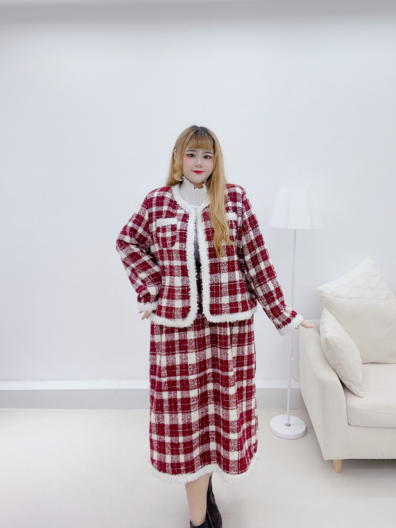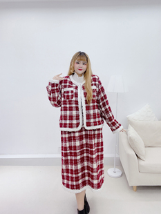 夹棉小香套装 名媛风300斤新年气质红格子长短款 女装 胖莹莹特大码