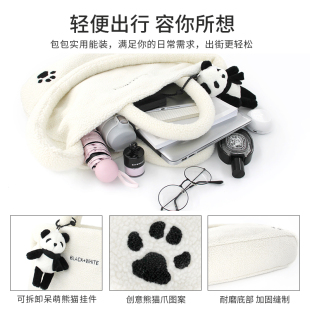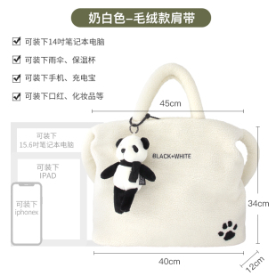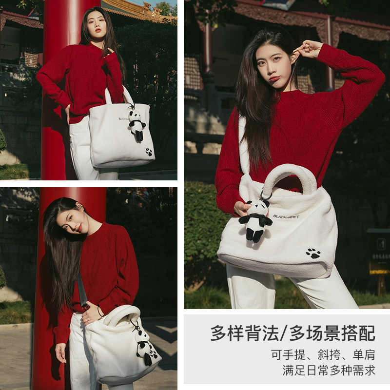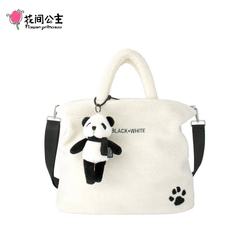 花间公主黑白配熊猫秋冬新仿羊羔毛绒包包软萌时尚 手提单肩斜挎包