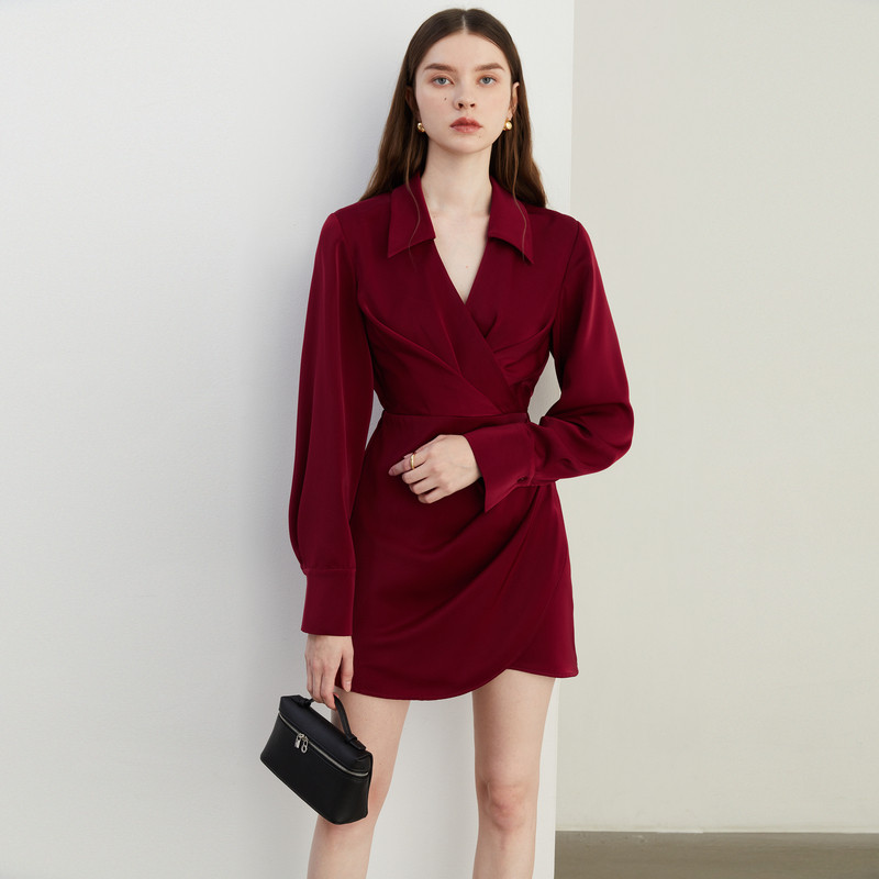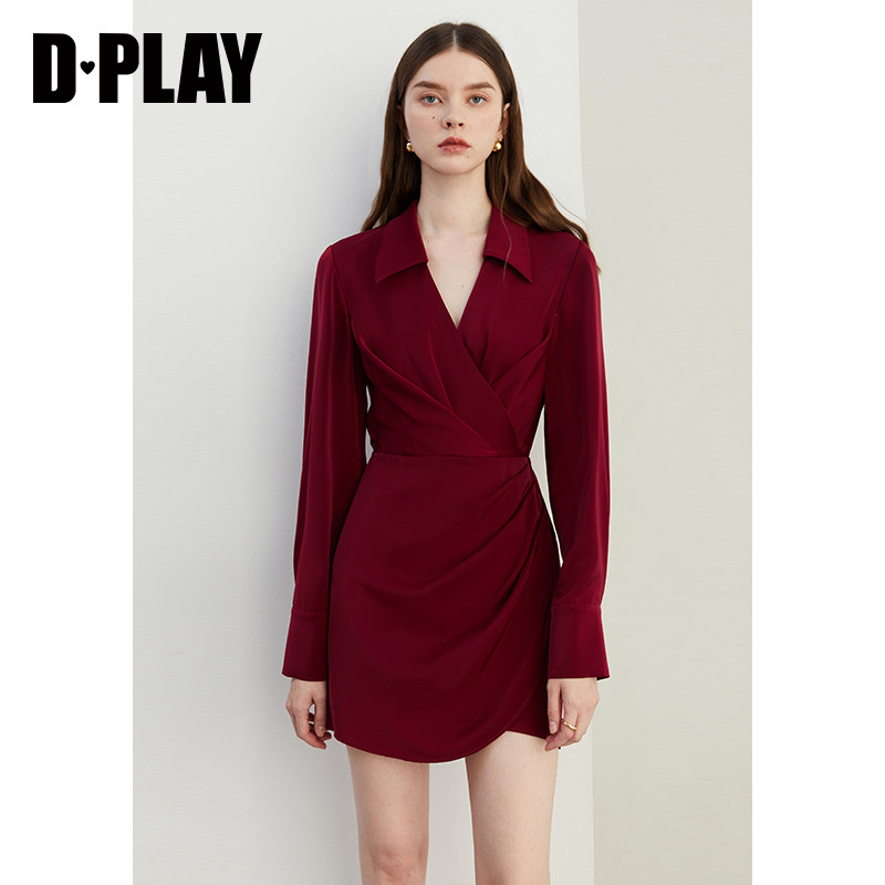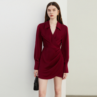 小红裙长袖 DPLAY2025秋季 衬衫 气质红色连衣裙女收腰复古短款 新款