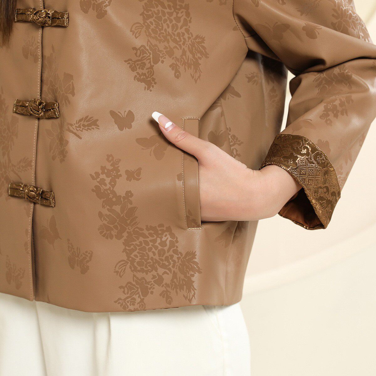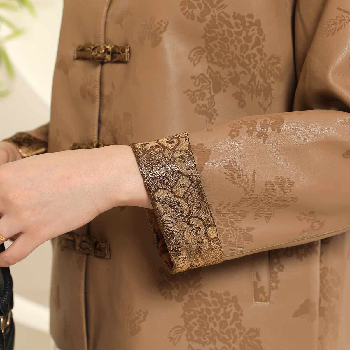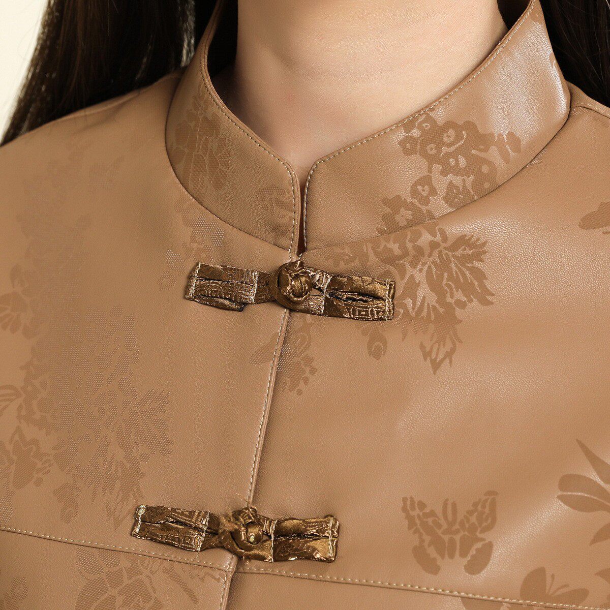 复古2025新款 上衣盘扣拼接春秋外套女立领短款 国风皮衣唐装 新中式