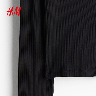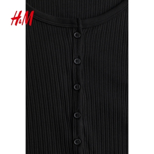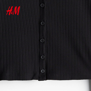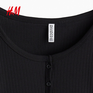 上衣打底衫 HM女装 纽扣前襟罗纹短款 休闲圆领时尚 1234738 T恤冬季