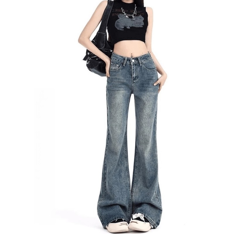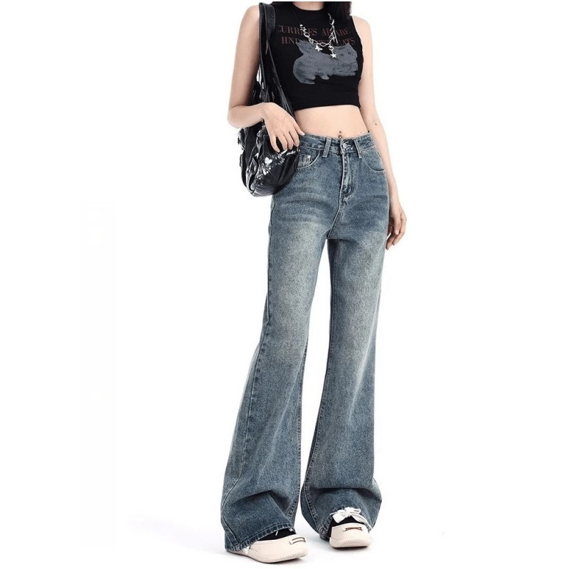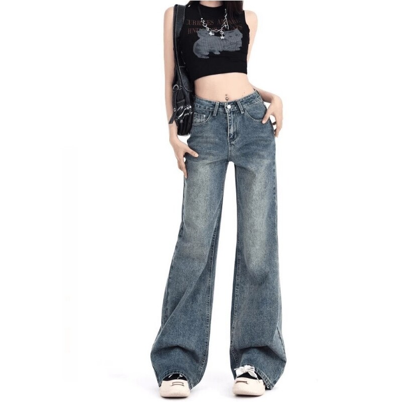 高腰阔腿牛仔裤 女2024复古蓝百搭设计感不贴腿微喇叭直筒拖地长裤