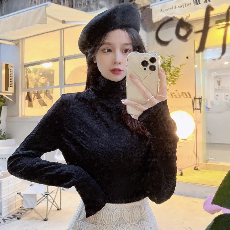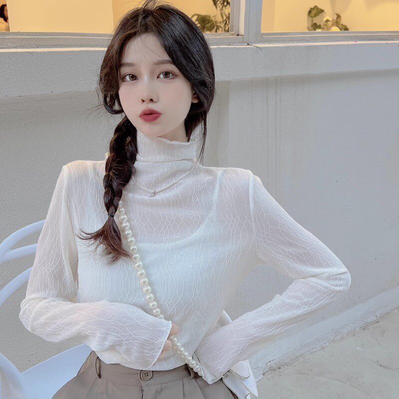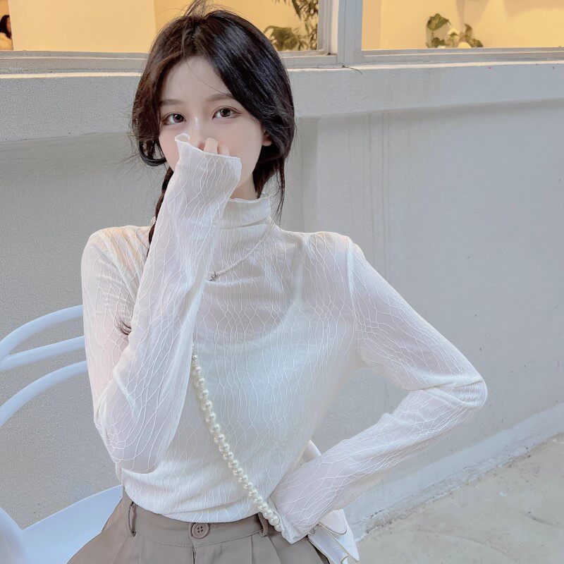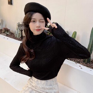 洋气小衫 女秋冬胖mm显瘦新款 网纱高领上衣 大码 木耳边蕾丝打底长袖