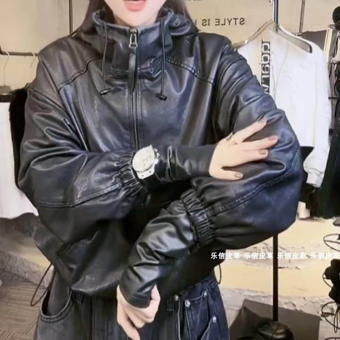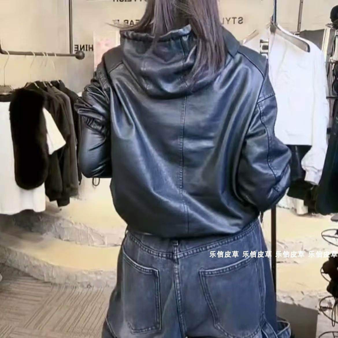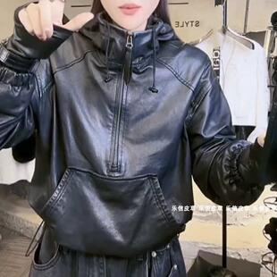 帅气运动风绵羊皮连帽皮衣外套女休闲时尚 显瘦百搭甜酷风轻奢高级