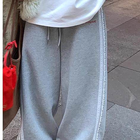 具象松弛舒适灰色抽绳束脚蕾丝花边超厚加绒卫裤 rouge周美美