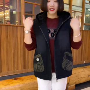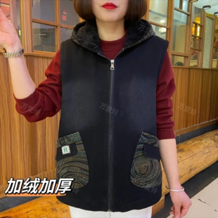 坎肩 女马夹无袖 休闲宽松连帽时尚 百搭印花马甲加绒外套老年妈妈装