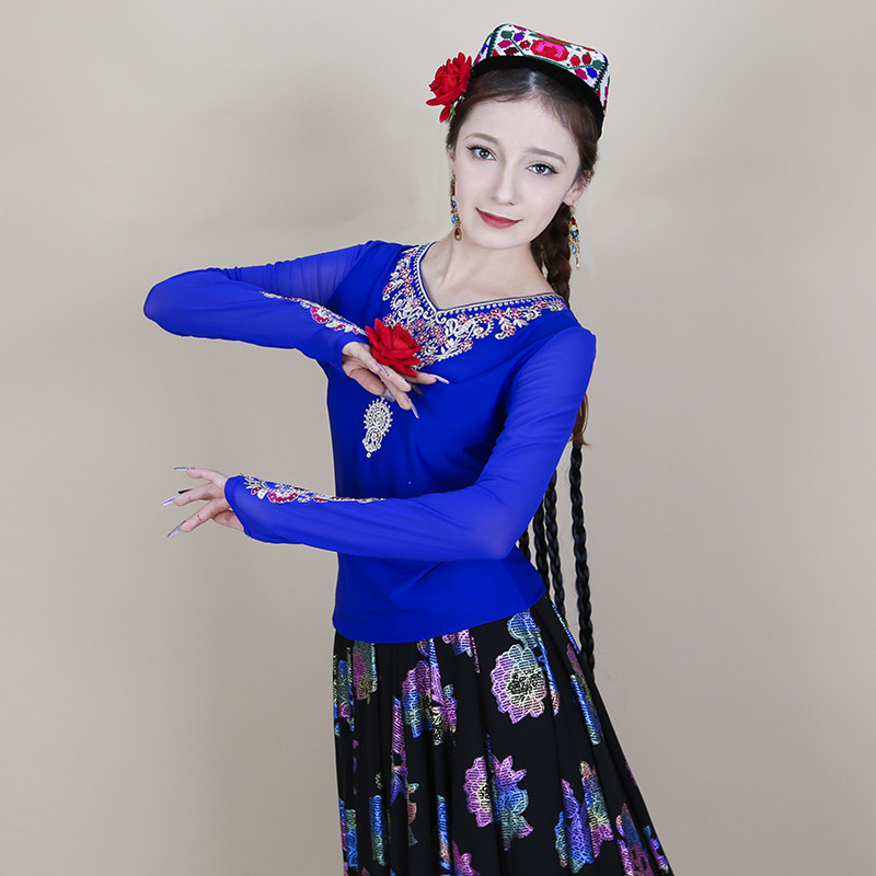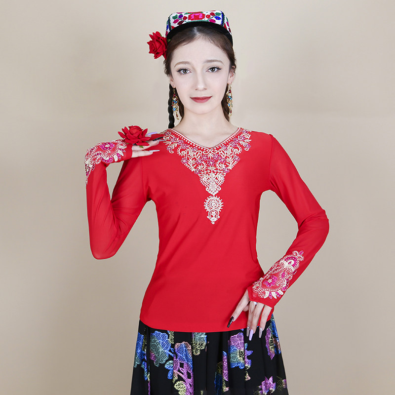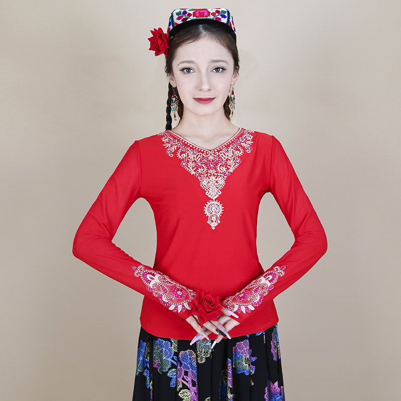 维族舞艺考生练功服上衣 民族风绣花烫钻打底衫 新款 新疆舞演出服装
