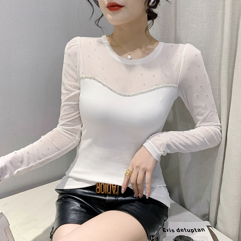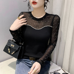 性感网纱拼接上衣气质百搭打底衫 2024春装 烫钻T恤女长袖 时尚 新款